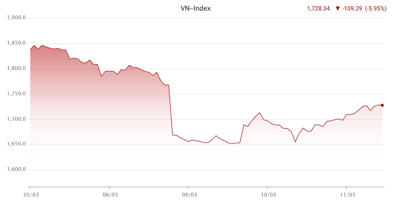 Kết phiên giao dịch ngày 11-3, thị trường tiếp tục có phiên hồi phục thứ hai liên tiếp với điểm số tăng cao. Chỉ số VN-Index tăng 51,6 điểm, tương ứng tăng 3,08%, lên mức 1.728 điểm.