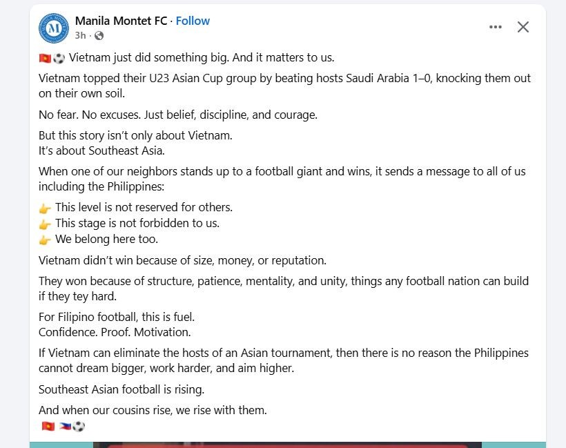 “Việt Nam vừa làm nên một điều rất lớn. Và điều đó có ý nghĩa với tất cả chúng ta. Việt Nam đã đứng đầu bảng A tại Giải U23 châu Á sau khi đánh bại đội chủ nhà Ả Rập Saudi với tỷ số 1–0, qua đó loại họ ngay trên sân nhà. Không sợ hãi. Không viện cớ. Chỉ có niềm tin, kỷ luật và lòng dũng cảm,” trang Manila Montet FC (Philippines) viết trên mạng xã hội Facebook ngày 13/1.