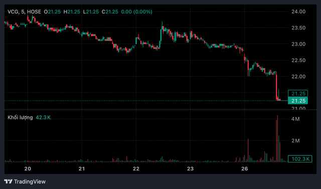 Trước nhịp giảm mạnh này, cổ phiếu VCG giao dịch tương đối ổn định trong các phiên gần đây, với biên độ dao động chủ yếu trong khoảng 22.500 - 23.600 đồng/cổ phiếu, thanh khoản duy trì quanh 4,4 - 8,8 triệu cổ phiếu mỗi phiên.
