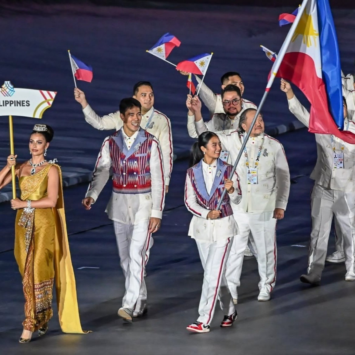 Trong trang phục barong truyền thống, Eala (sinh năm 2005), tay vợt tennis hiện đứng hạng 52 thế giới, trở thành tâm điểm khi sải bước dẫn đầu đoàn.