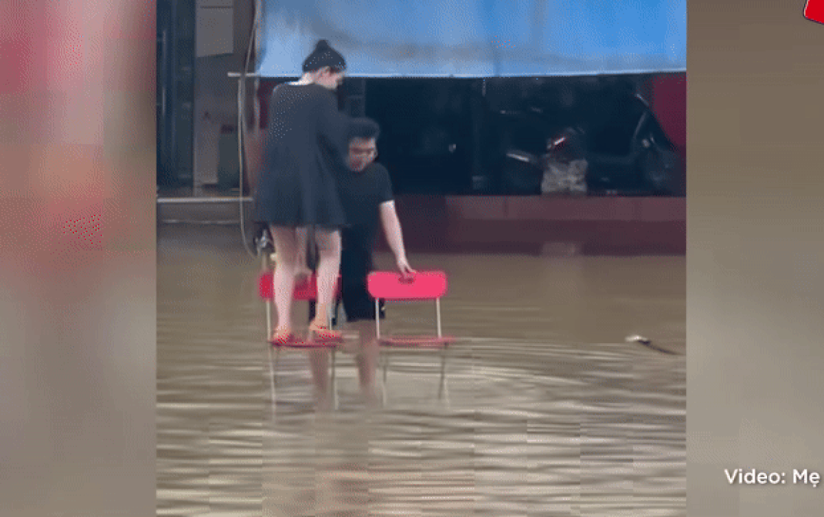 Theo đó, giữa dòng nước ngập nặng, người chồng mang 2 chiếc ghế ra đường, bắc làm cầu cho vợ đi vào nhà. Người vợ chậm rãi từng bước để bước trên 2 chiếc ghế cao. Sự việc ngay lập tức thu hút sự chú ý của những người xung quanh.