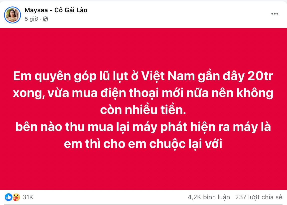 Đây là lần đầu tiên trong hơn 6 năm sống và học tập tại Việt Nam, Maysaa gặp phải sự cố như vậy. Cô cho biết trước đó vừa ủng hộ khoảng 20 triệu đồng cho đồng bào vùng lũ, cô vừa mua điện thoại mới nên khá sốc khi mất tài sản giá trị.