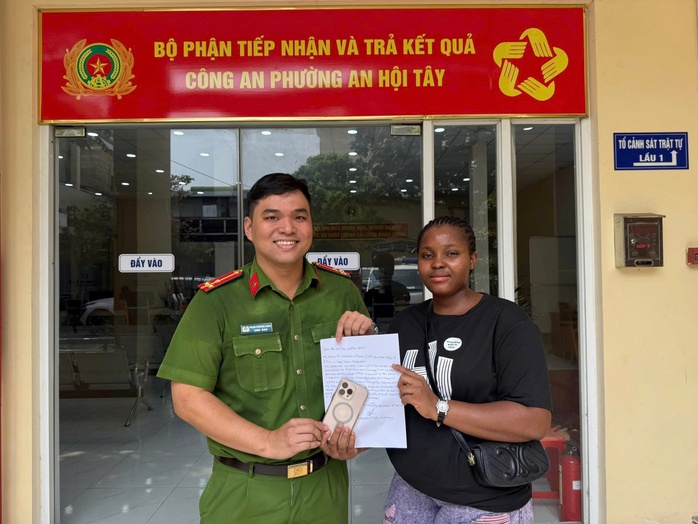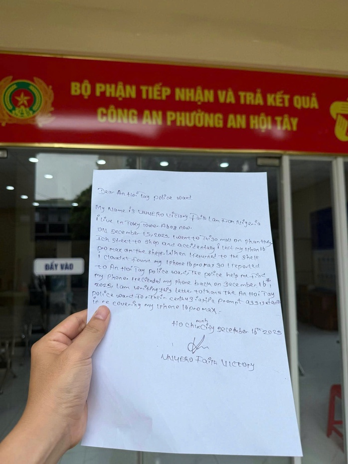 Anh N. sau đó đã trao trả lại điện thoại cho chị Victory Faith Unuero. Để bày tỏ lòng biết ơn, chị Victory Faith Unuero đã viết thư gửi Công an phường An Hội Tây.