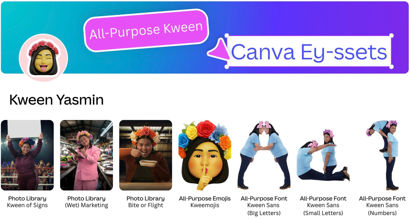 Ngoài font chữ, người dùng có thể tìm thêm những yếu tố khác liên quan đến Kween Yasmin trên Canva như Kweemojis - bộ biểu tượng cảm xúc, Kween of Signs - các ảnh cô nàng cầm bảng trắng để tùy ý thêm chữ chú thích, Wet Marketing - các hình mẫu cô nàng tái hiện những meme nổi tiếng của mình.