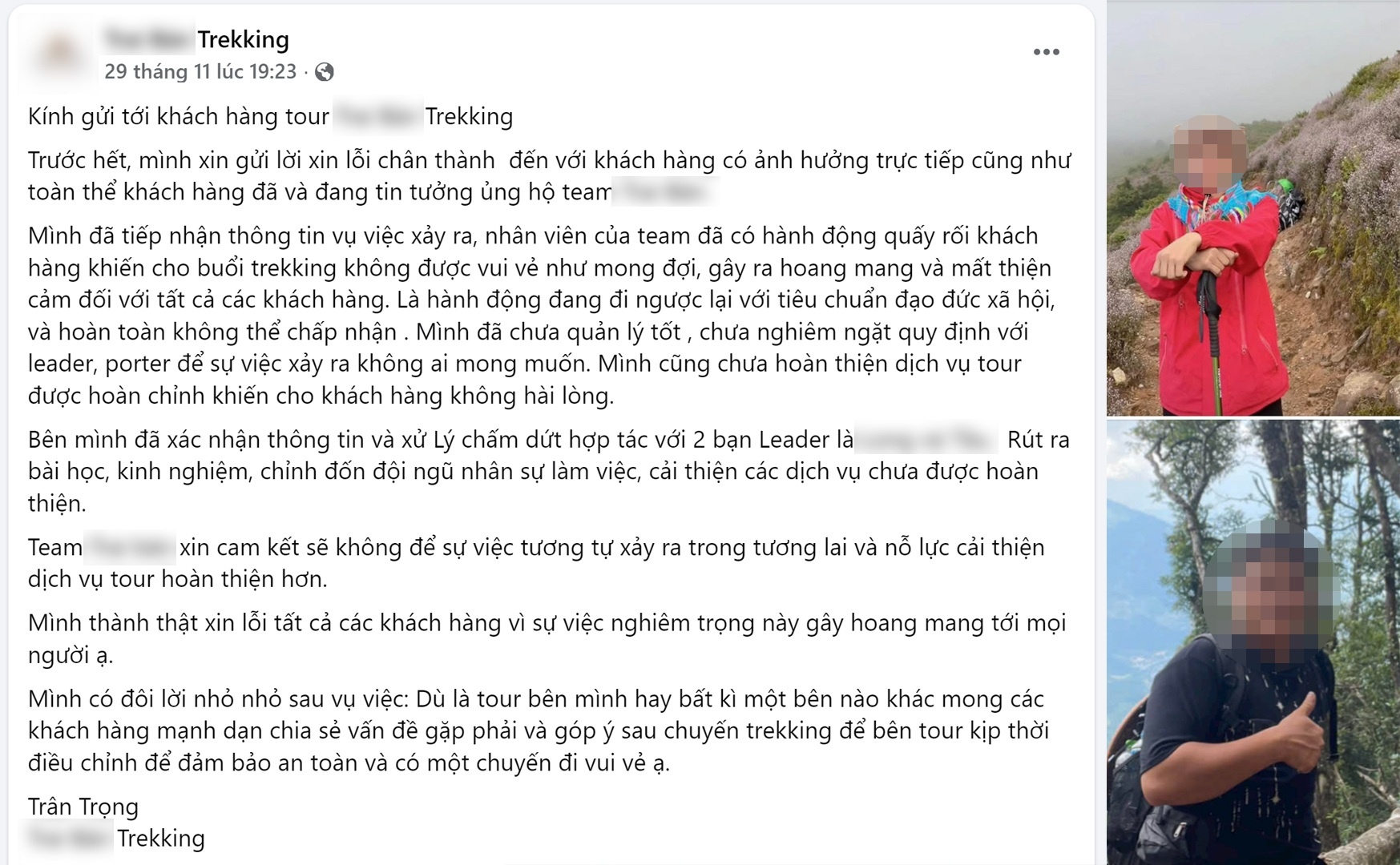 Trước sức ép của dư luận, phía T.B. Trekking sau đó đã đăng bài viết xin lỗi, thừa nhận hành vi sai trái của nhân sự. Đơn vị cho biết đã chấm dứt hợp tác với hai người bị tố là T. và L. Tuy nhiên, cách công ty xử lý tiếp tục gây tranh cãi.