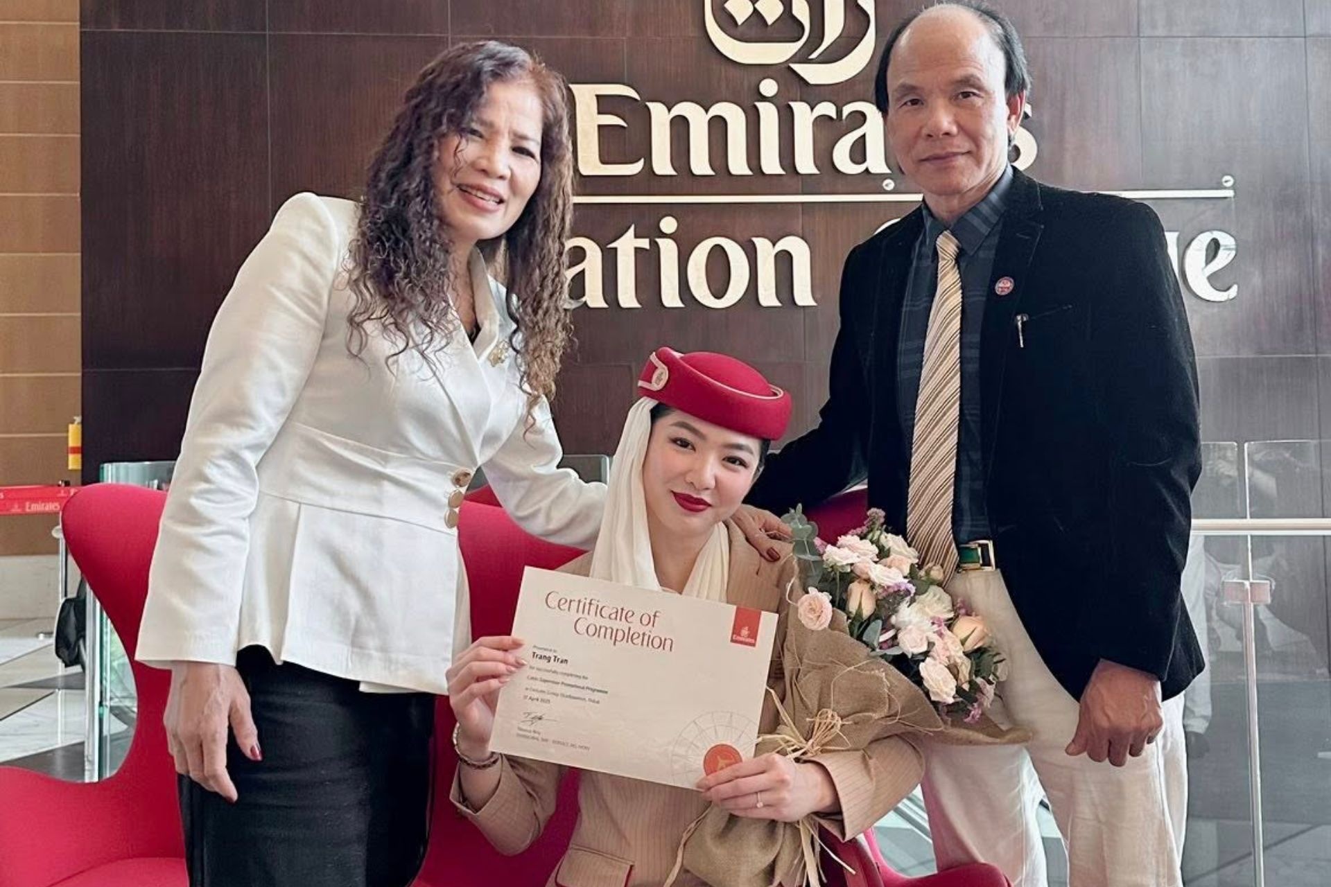 Bố mẹ tham dự lễ tốt nghiệp tiếp viên phó tại Emirates của Huyền Trang.