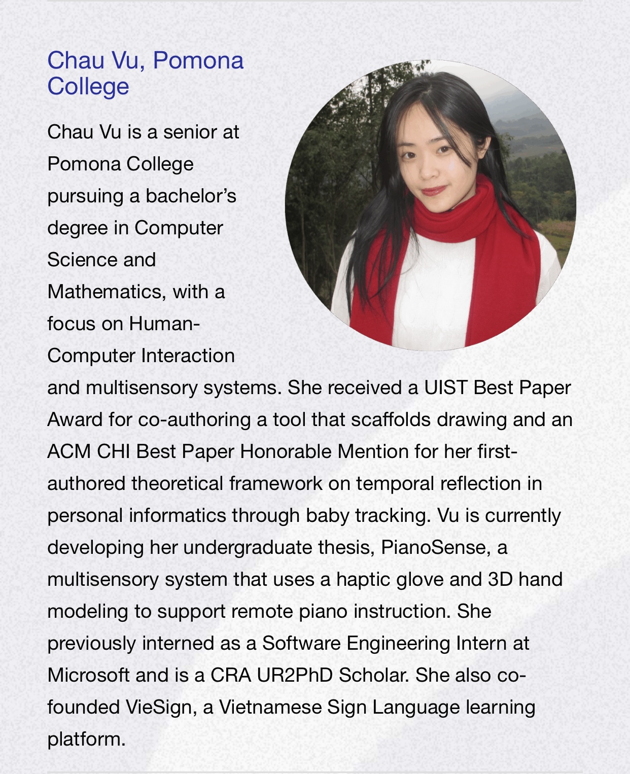 “Em muốn nghiên cứu ở giao điểm giữa khoa học máy tính và tương tác giữa con người với trí tuệ nhân tạo”, Hà Châu nói. “Mỗi lần được ghi nhận, em lại được tiếp thêm động lực để tiếp tục con đường nghiên cứu”.