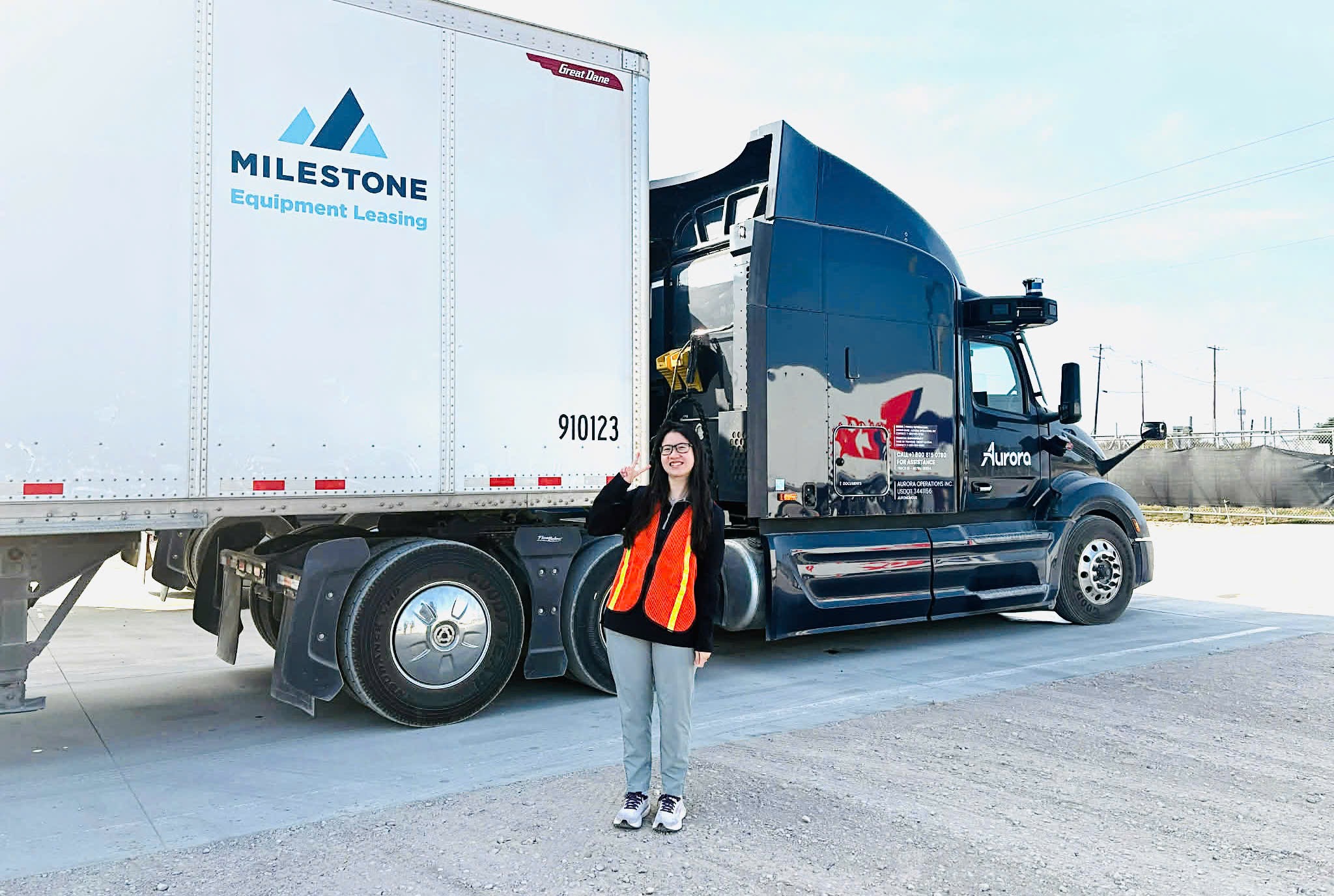 Khánh Vy đi khảo sát thực tế tại khu vực vận hành xe tải tự lái Aurora ở trụ sở Texas, tháng 11/2025.