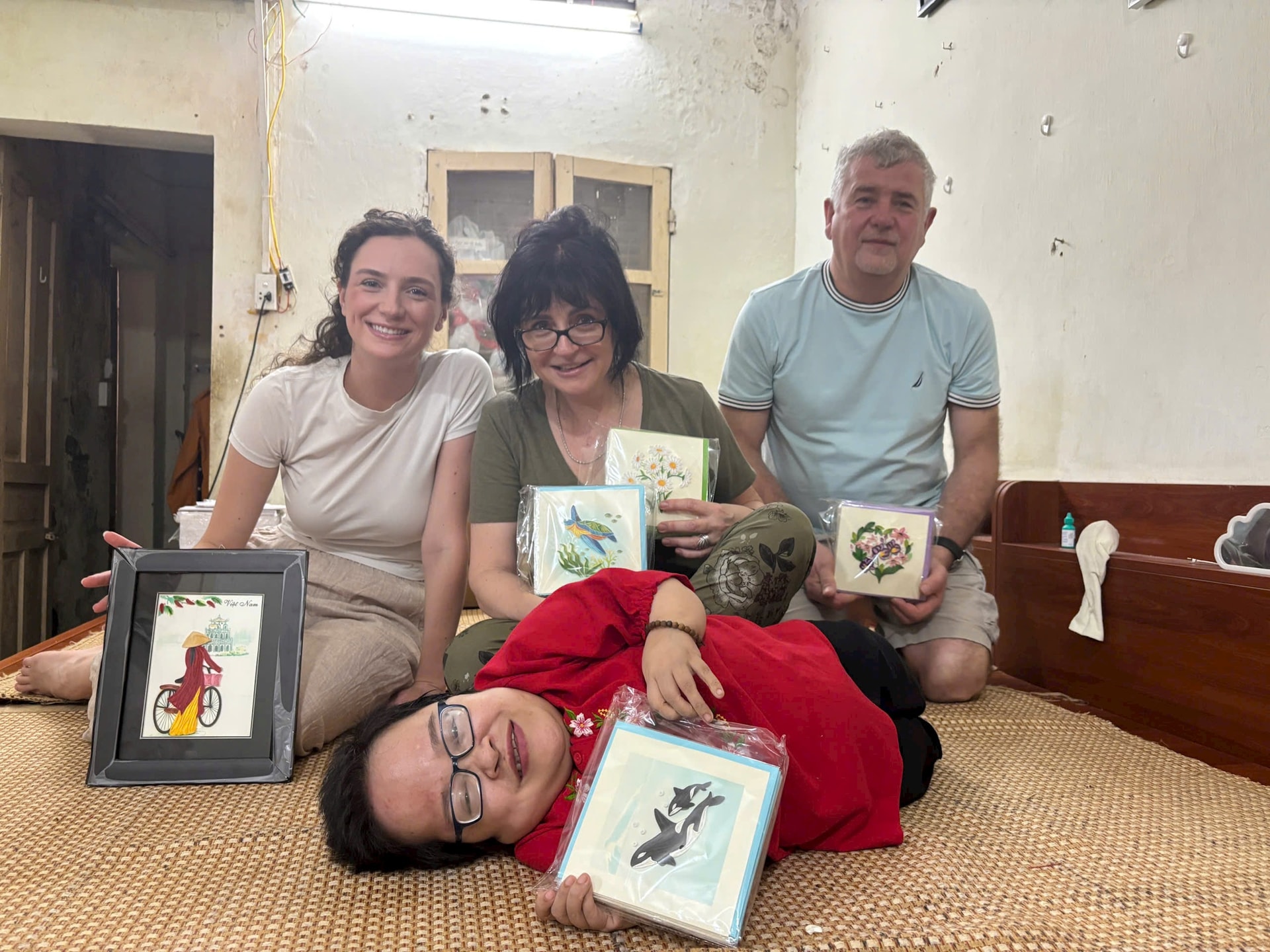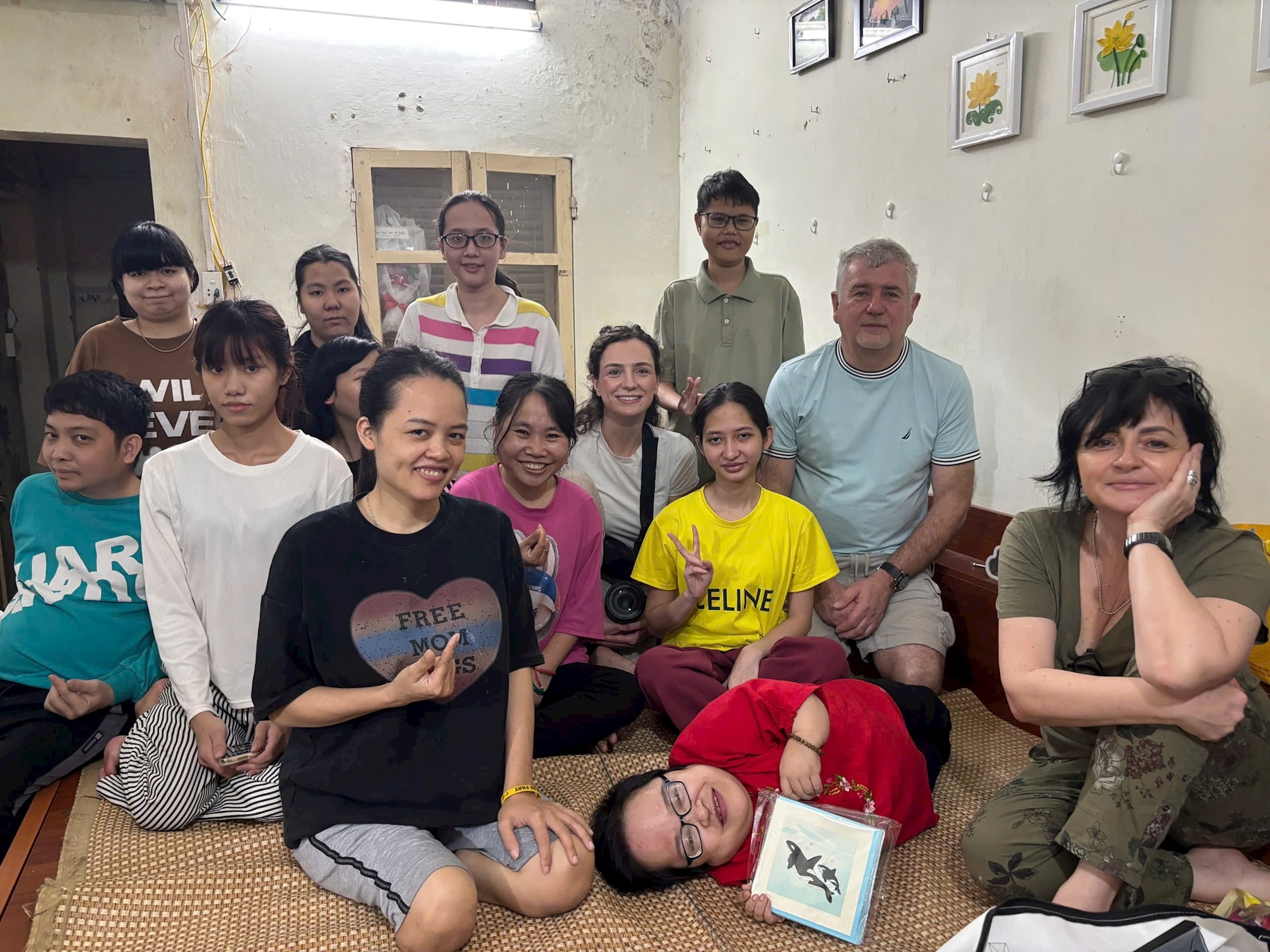 Khách nước ngoài thăm chị Thu Thương và những người bạn khuyết tật. Ảnh: Thương Thương