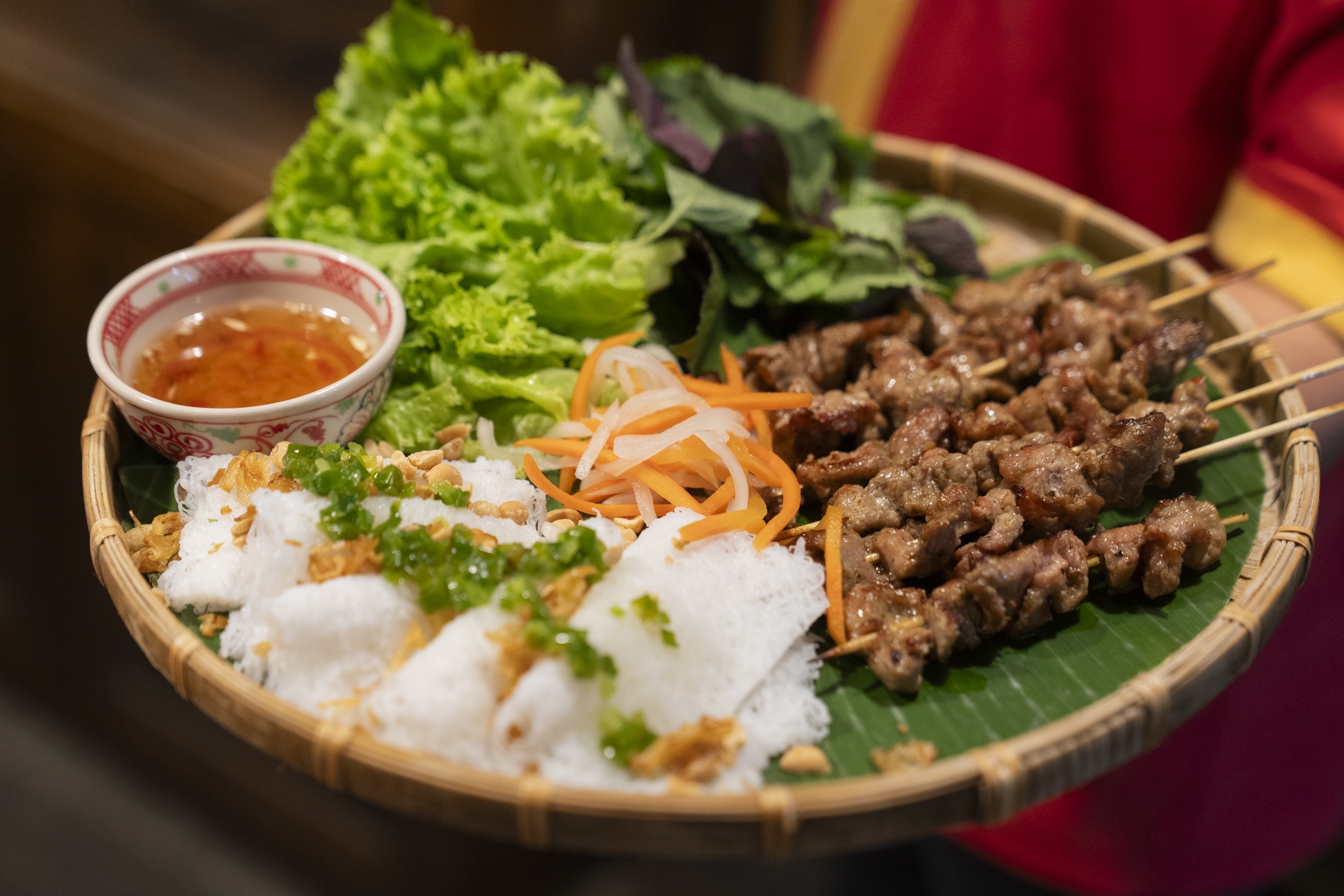 Thực đơn xoay quanh các món cuốn - bánh xèo tôm thịt, nem nướng, chả cá Lã Vọng - được bày trong mẹt tre dân dã. Rau xanh và rau thơm luôn chiếm nửa mẹt, khiến món Việt trở nên nhẹ nhàng và tươi mới.