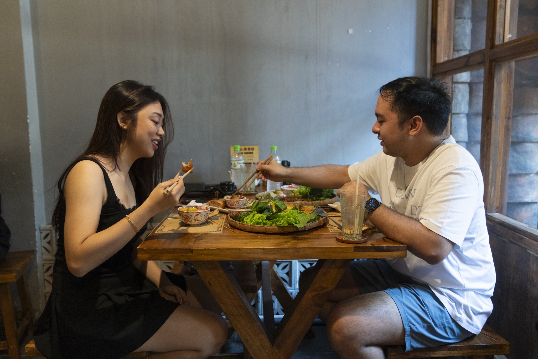 Ynito và Ky thưởng thức những món ăn đặc trưng được TikTok gợi ý tại nhà hàng trên phố Nguyễn Thái Bình.