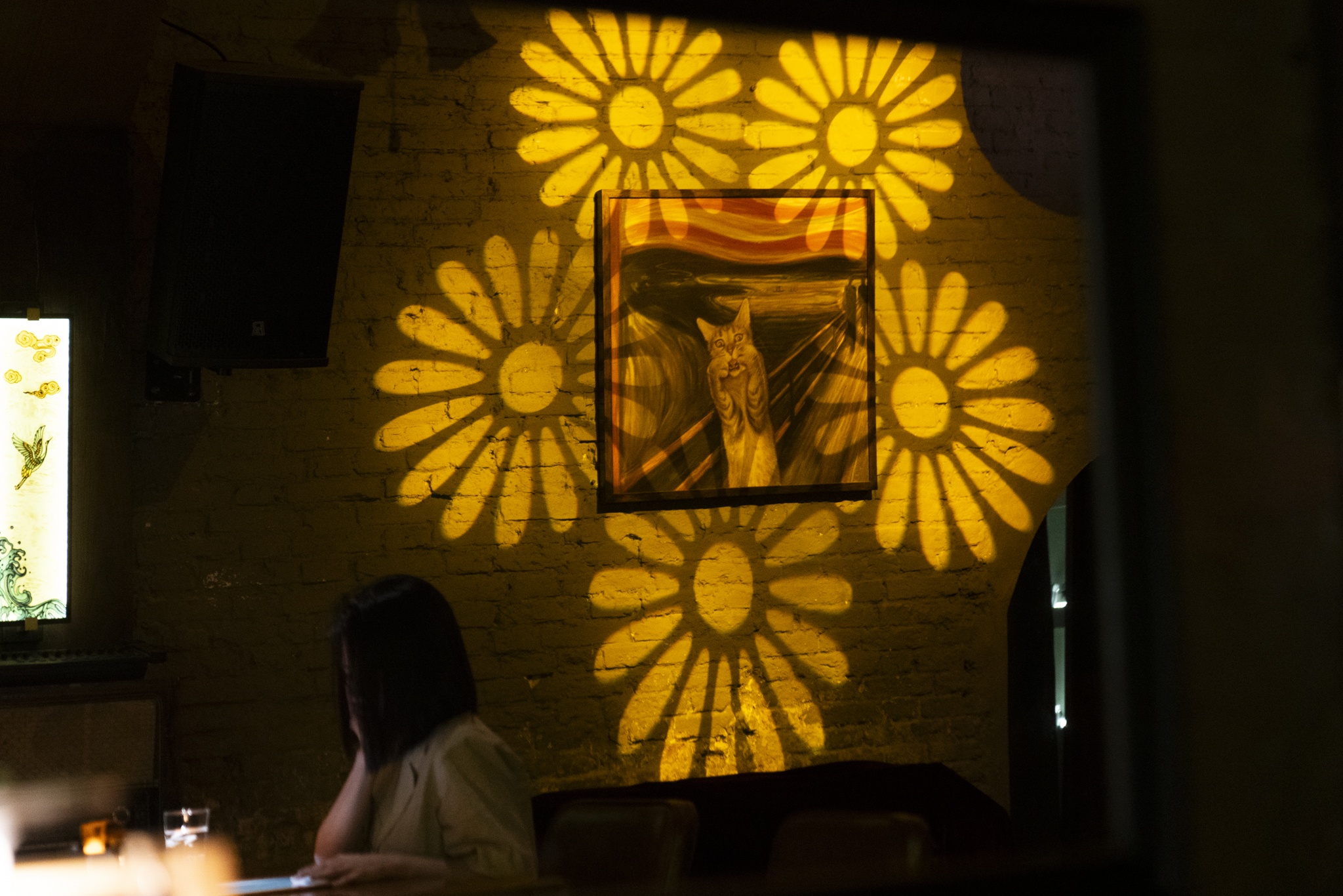 Đằng sau chiếc tủ đựng máy ảnh là không gian quán bar tối giản, ấm cúng.