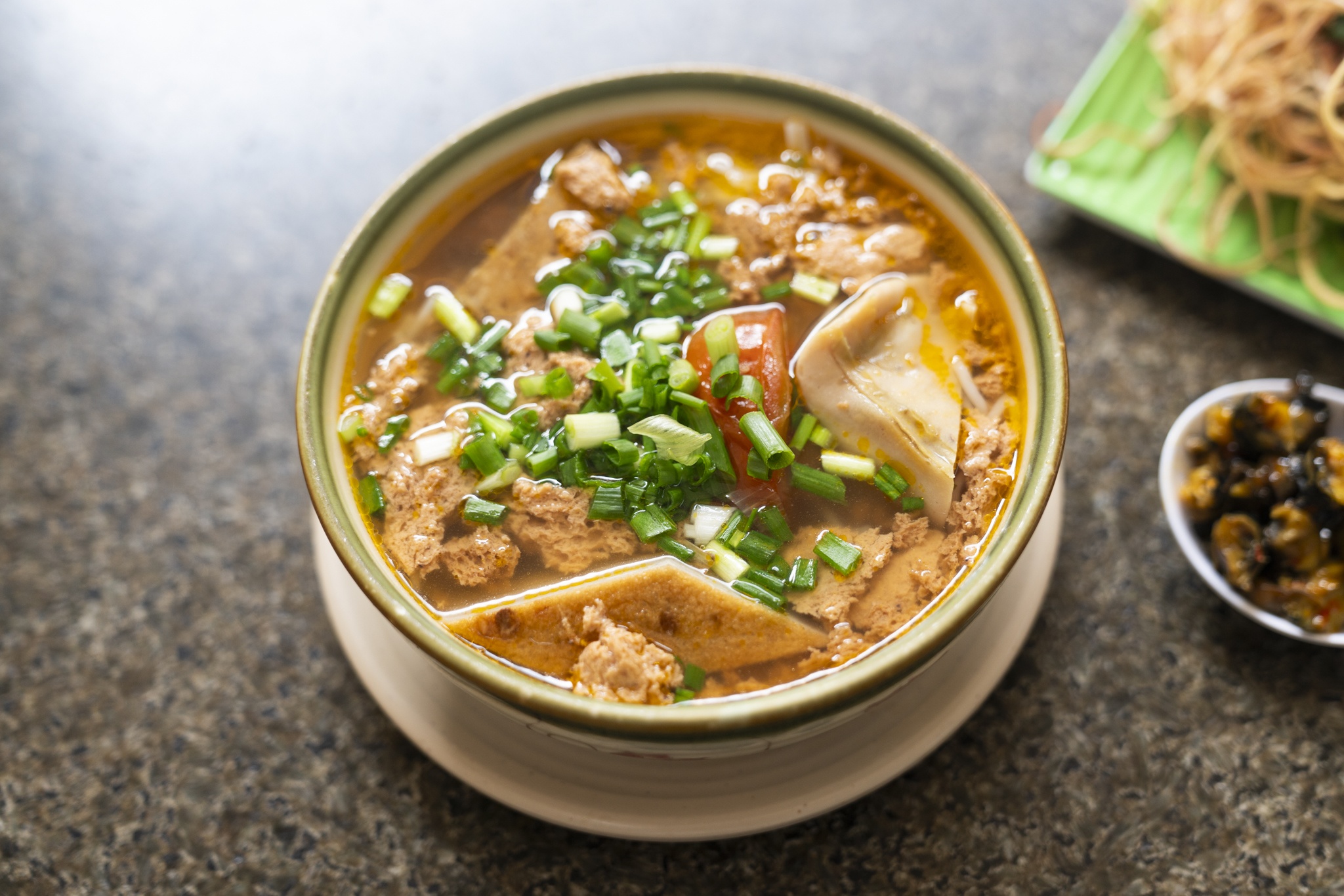 Tô bún riêu với nước dùng đậm đà, thịt ốc dai ngon, riêu cua béo ngọt sẽ giúp du khách nạp đầy năng lượng cho ngày dài khám phá.