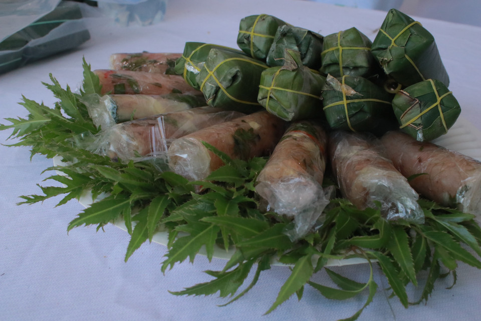 Món nem chua Thanh Hóa ăn kèm với lá đinh lăng. (Ảnh: Minh Anh/Vietnam+)