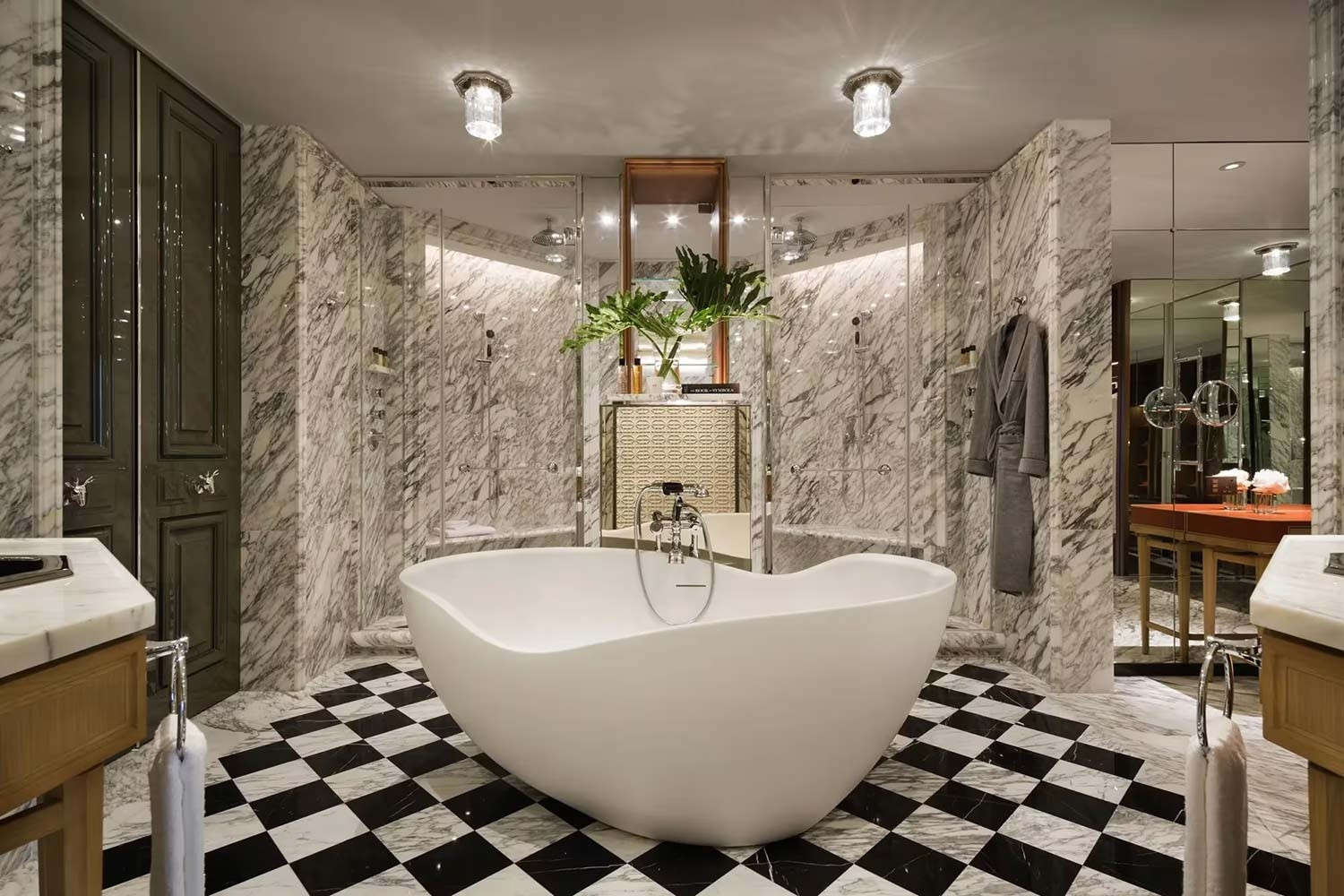 Phòng tắm sang trọng với đá cẩm thạch, bồn tắm, bồn rửa đôi, vòi sen đôi và gương vô cực. (Ảnh: Remoteland)