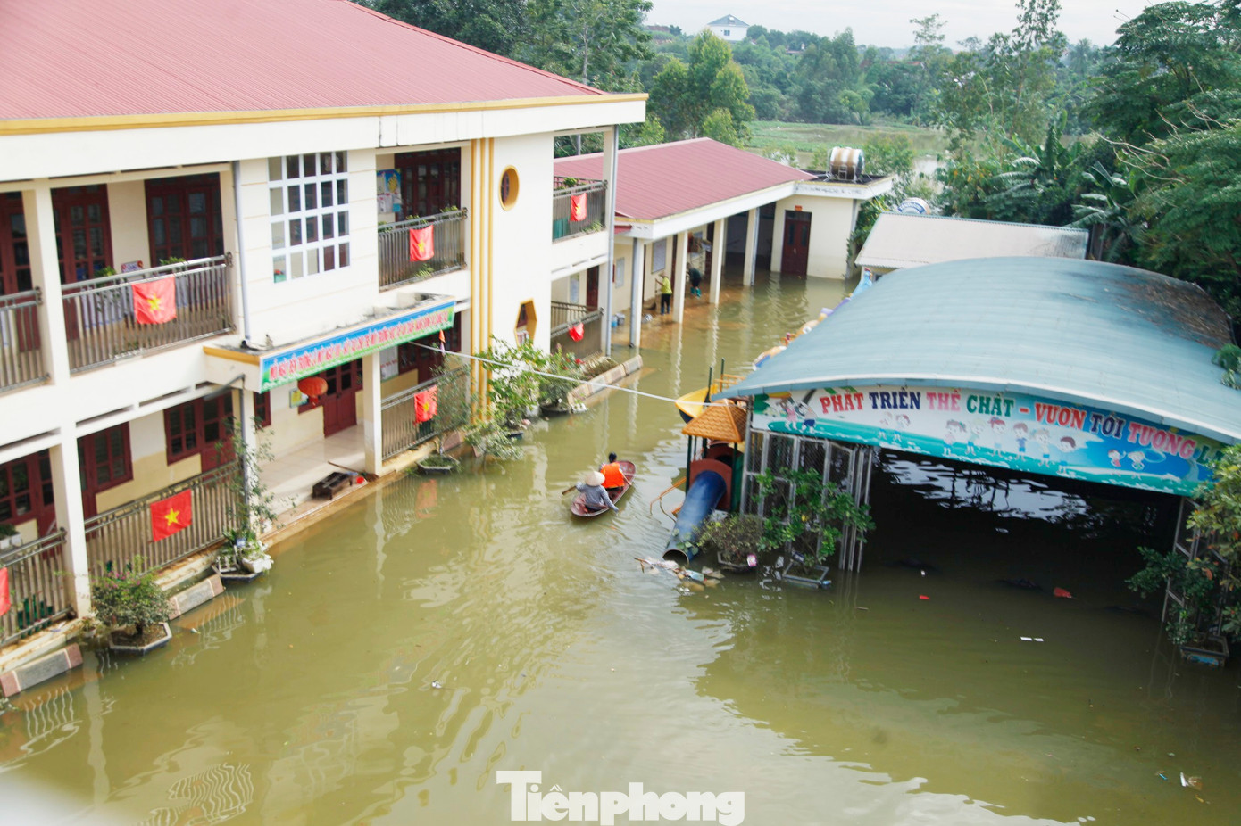 Trường Mầm non Dương Đức vẫn còn bị ngập ở sân trường. Ảnh: Nguyễn Thắng