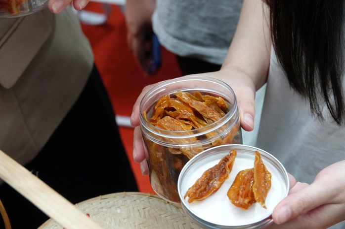 Cô Nhung đưa sản phẩm mứt khế giới thiệu đến khách hàng tại một sự kiện ở Cần Thơ