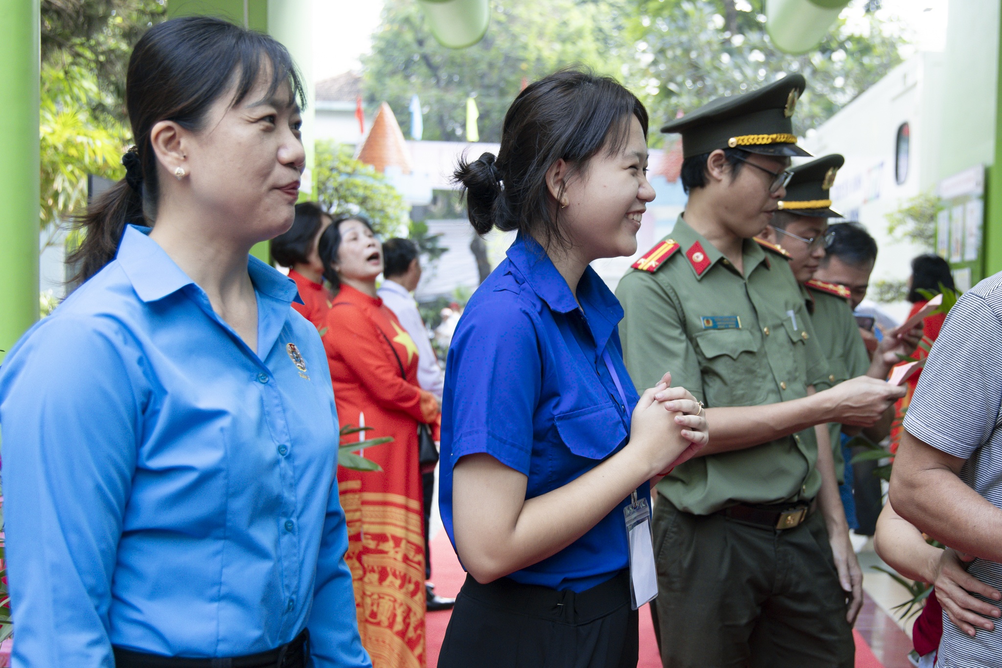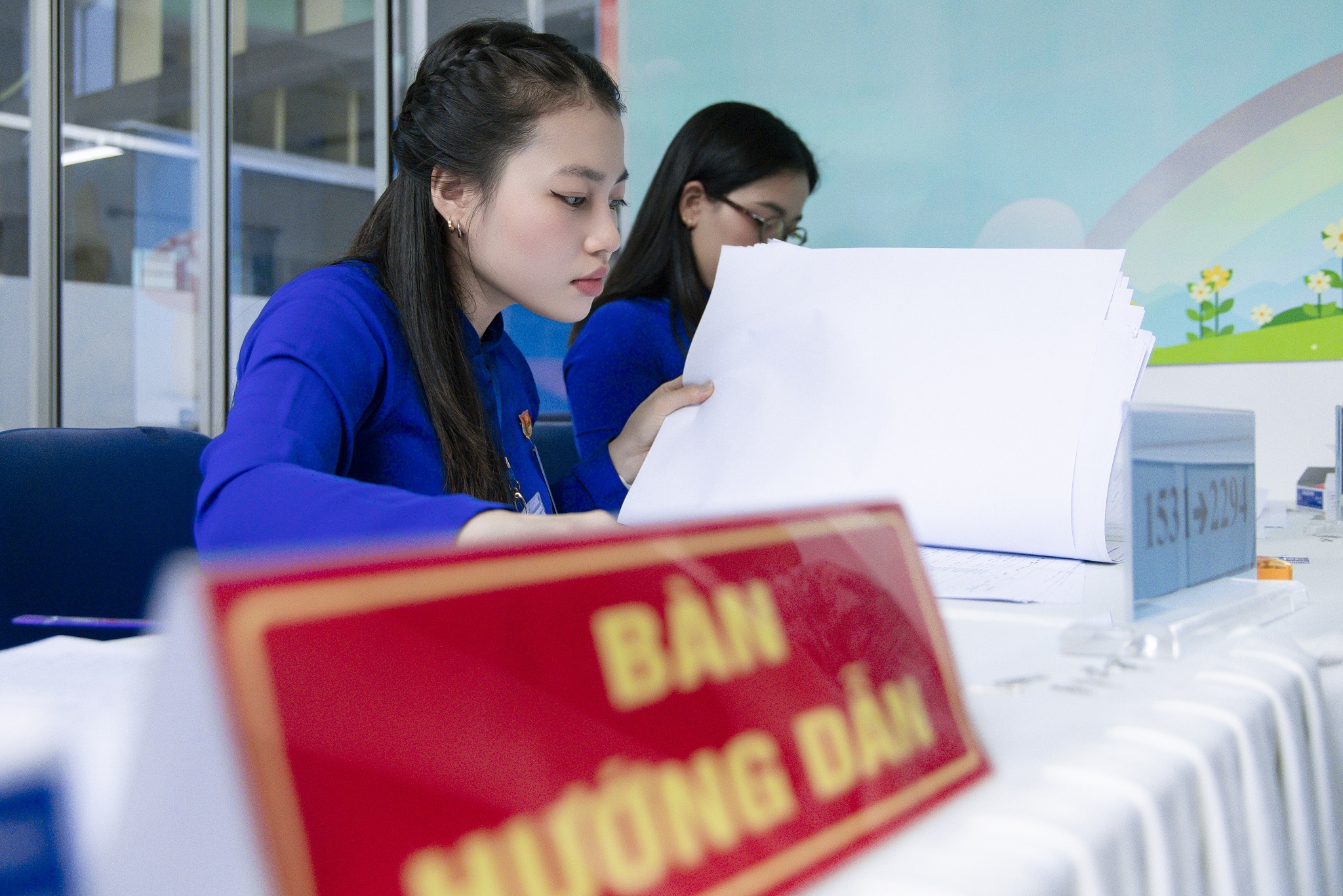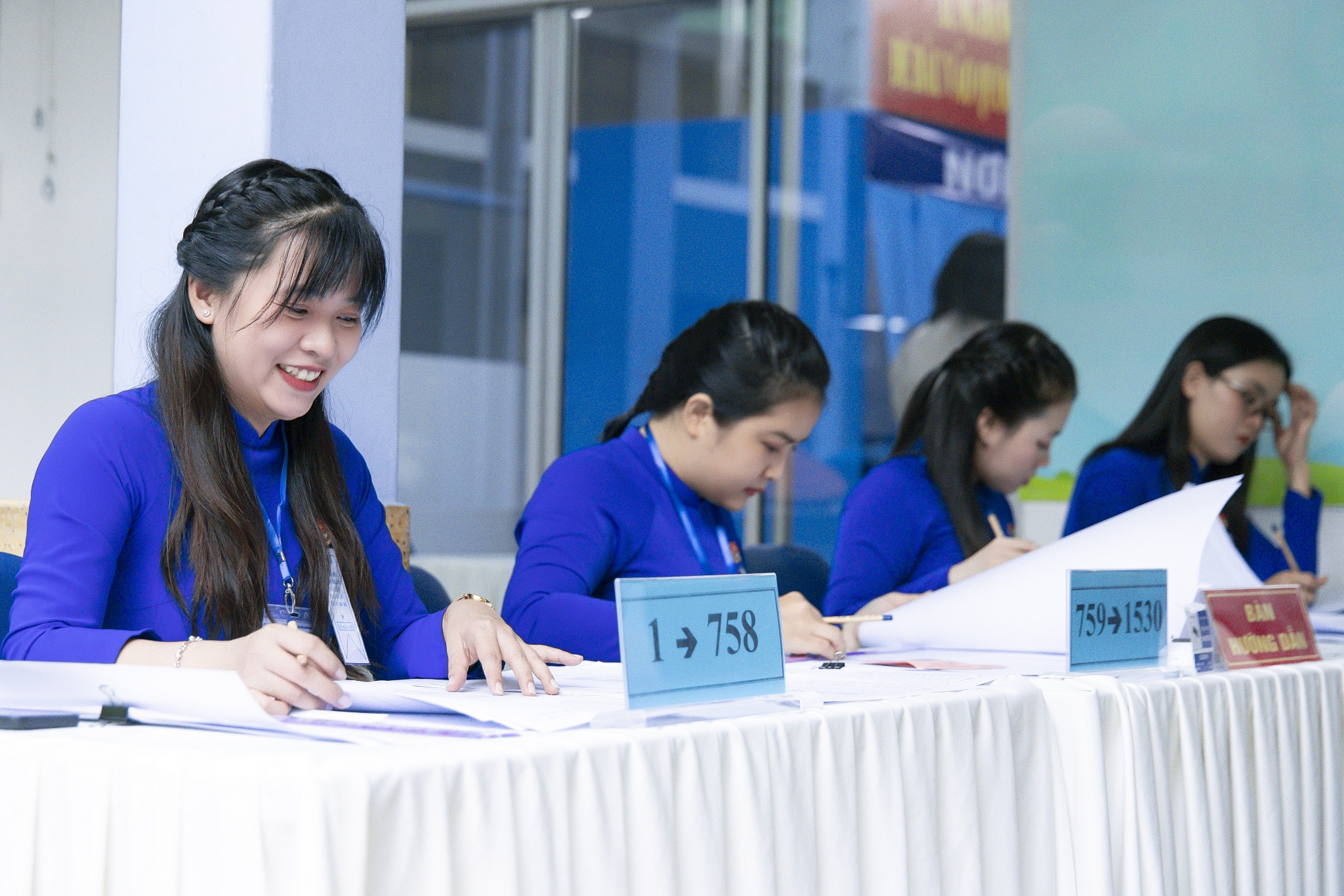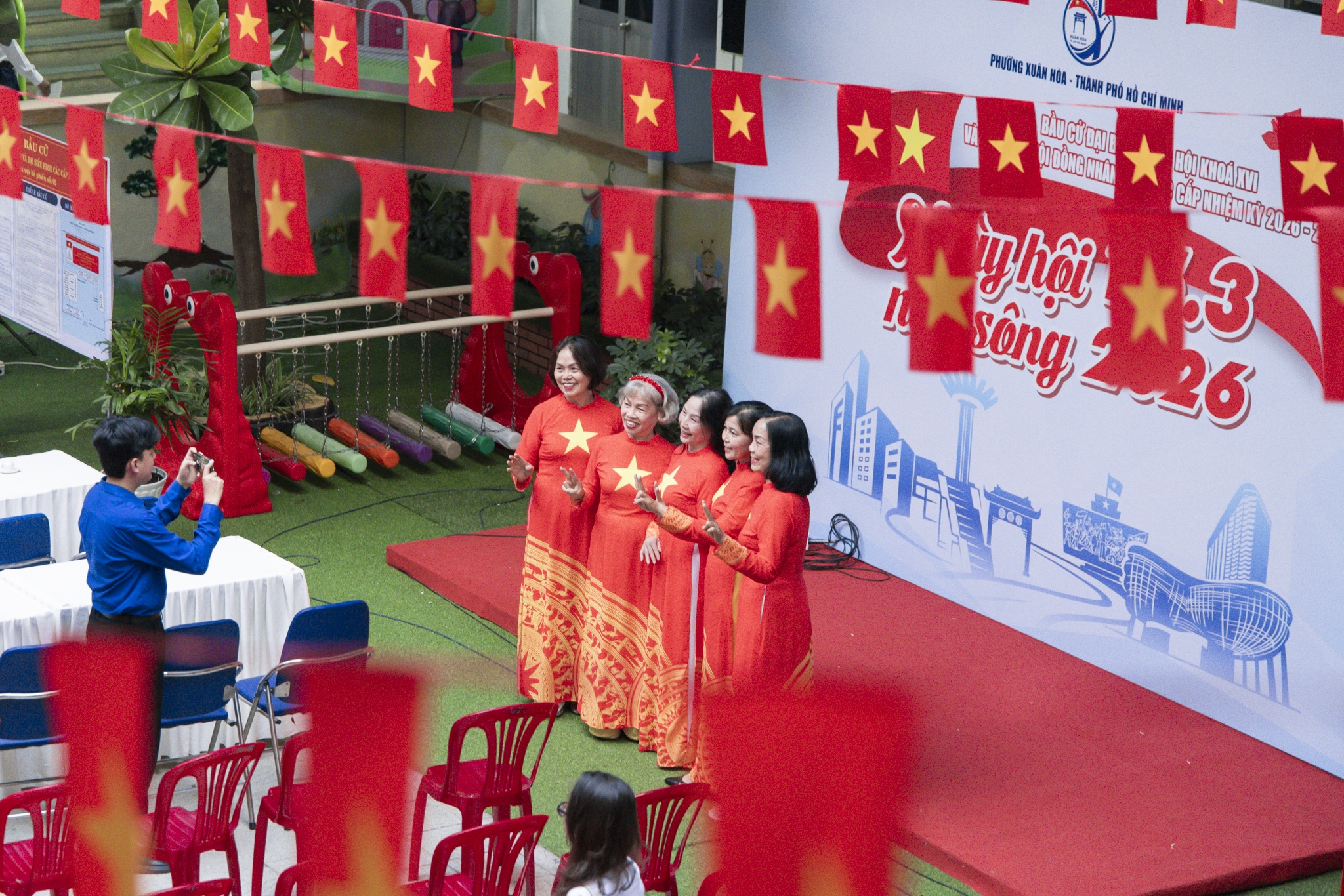 Cách đó không xa, bàn hướng dẫn cử tri cũng tất bật từ sớm. Ngô Huỳnh Ngà (sinh năm 2000, quê ở Bình Thuận, ngoài cùng bên phải), giáo viên Trường Mầm non Tuổi thơ 7, cũng dốc sức cho công tác chuẩn bị. Khác với sự năng nổ ở vòng ngoài, Ngà tham gia sâu hơn vào các khâu kỹ thuật. Ngà cho biết, lúc mới bắt đầu, cô cảm thấy khá hồi hộp vì bản thân chưa thực sự hiểu rõ các quy trình của công tác bầu cử. Tuy nhiên, sau khi tham gia các lớp tập huấn và học hỏi từ những người đi trước, cô đã nhanh chóng nắm bắt được tinh thần.