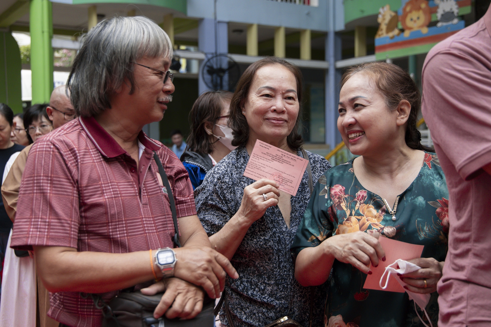 Một sinh viên tình nguyện năm 4 Trường Đại học Mở TP.HCM (chính giữa) tham gia hỗ trợ vòng ngoài, hướng dẫn cử tri vào điểm bỏ phiếu tại phường Xuân Hòa.