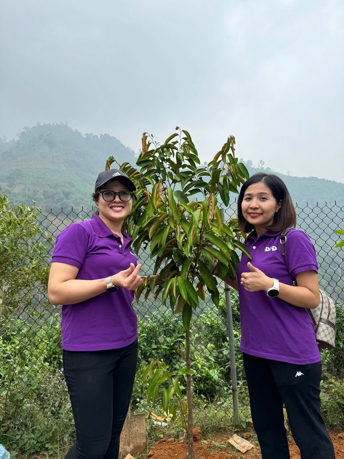 Ngoài quyên góp quần áo, sách vở, cô giáo Nguyễn Thị Khánh Huyền (bên phải) còn tặng cây, trồng cây tại các điểm thiện nguyện Ảnh: NVCC