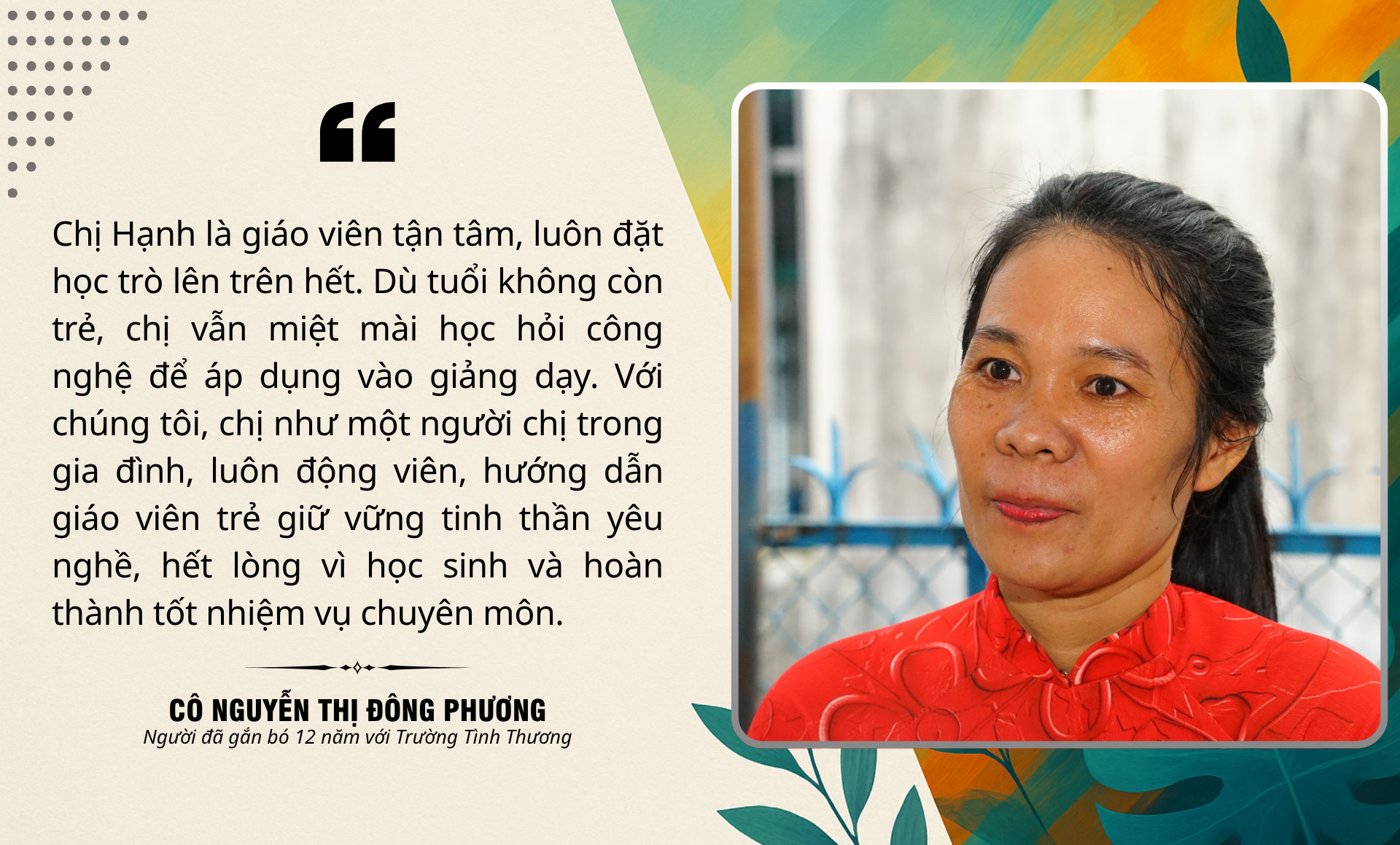 Thầy Lê Thanh Hoàng còn cho biết thêm, cô Hạnh là một trong những tấm gương bền bỉ “ở lại” để các giáo viên trẻ noi theo. “Đã có nhiều thế hệ giáo viên đến rồi lại rời trường vì vất vả. Nhưng với cô Hạnh, ở Trường Tình Thương thì thầy cô phải theo học trò, chứ trò không thể theo thầy cô như ở những môi trường khác”, thầy Hoàng chia sẻ.