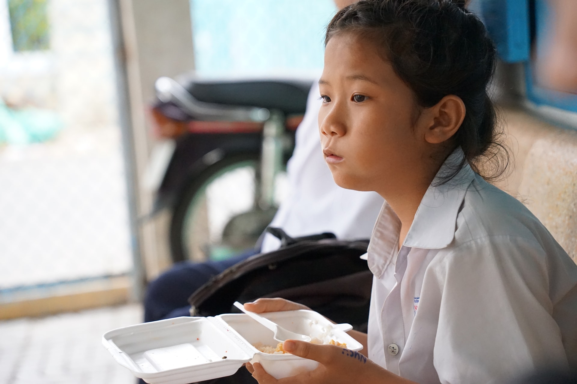 Giờ ra chơi, em Nguyễn Thị Như Linh ngồi trên chiếc ghế đá cùng hộp cơm đã nguội ngắt. "Con đi bán vé số về muộn, đã đến giờ học nên chỉ kịp mua hộp cơm 10 ngàn đồng mang theo, giờ ra chơi con ăn". Em Linh chia sẻ.