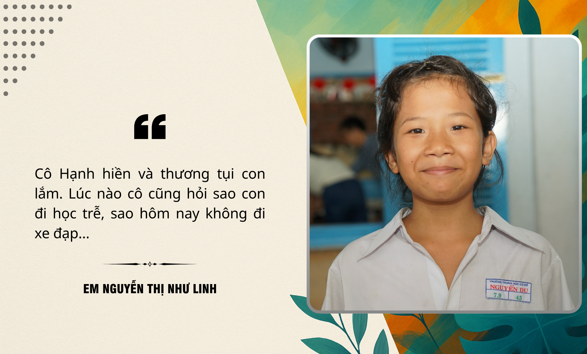 Thầy Lê Thanh Hoàng, Phó Hiệu trưởng phụ trách Trường Tình Thương, chia sẻ: “Cô Hạnh không chỉ là một giáo viên nhiệt huyết, mà còn là chỗ dựa tinh thần của học trò nơi đây. Suốt chặng đường gắn bó, cô thuộc lòng từng hoàn cảnh, biết rõ từng mái nhà các em sống. Giờ dạy của cô thường kết thúc muộn hơn các lớp khác, bởi cô muốn chắc chắn rằng học sinh phải hiểu bài thật kỹ mới yên tâm. Em nào không có xe đạp, hoặc xe hư giữa chừng, học xong cô lại lặng lẽ chở về tận nhà.”