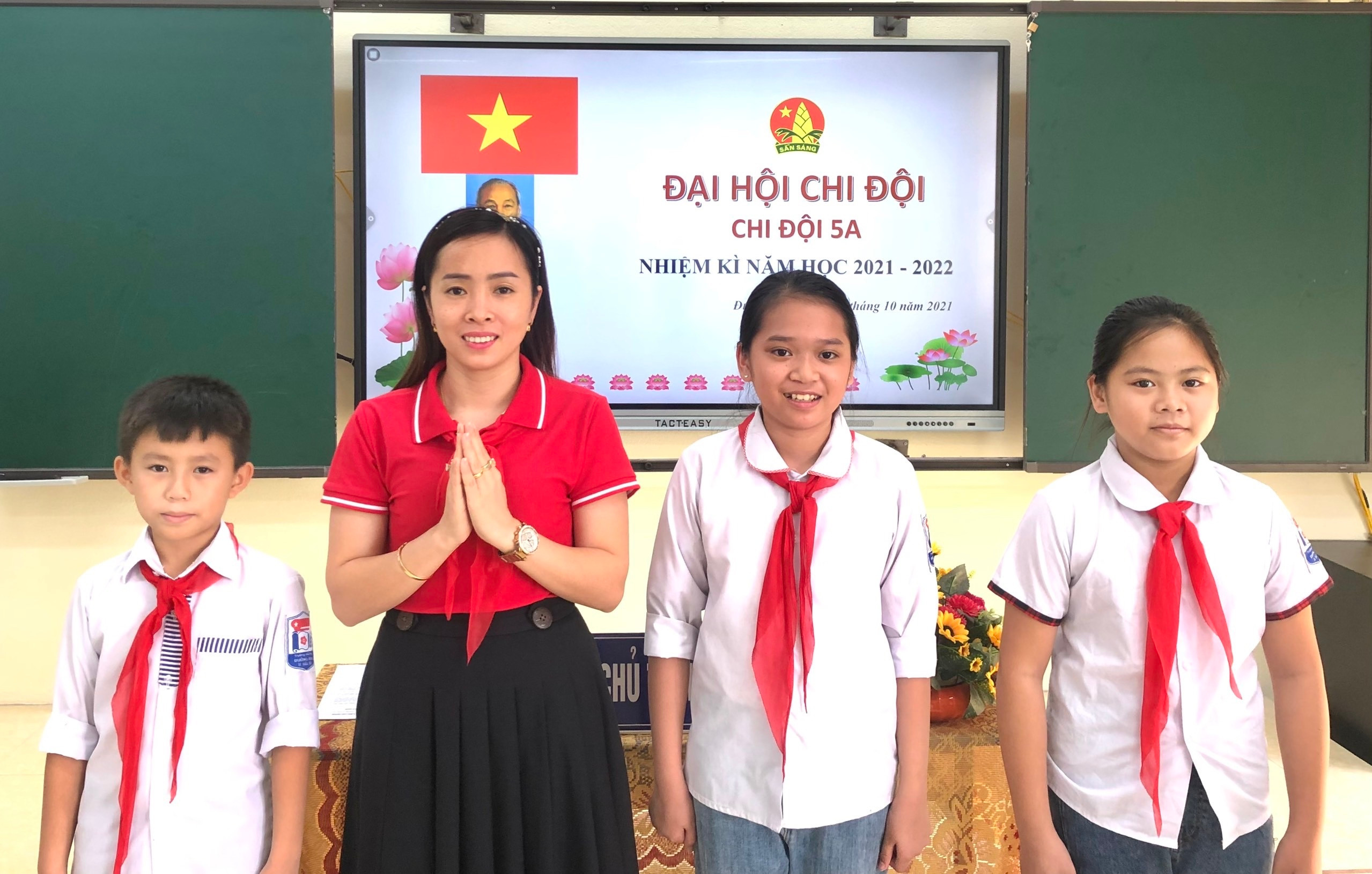 Cô Thu tổ chức Đại hội Chi đội cho học sinh lớp 5A, Trường Tiểu học Đường Hoa, Hải Phòng.