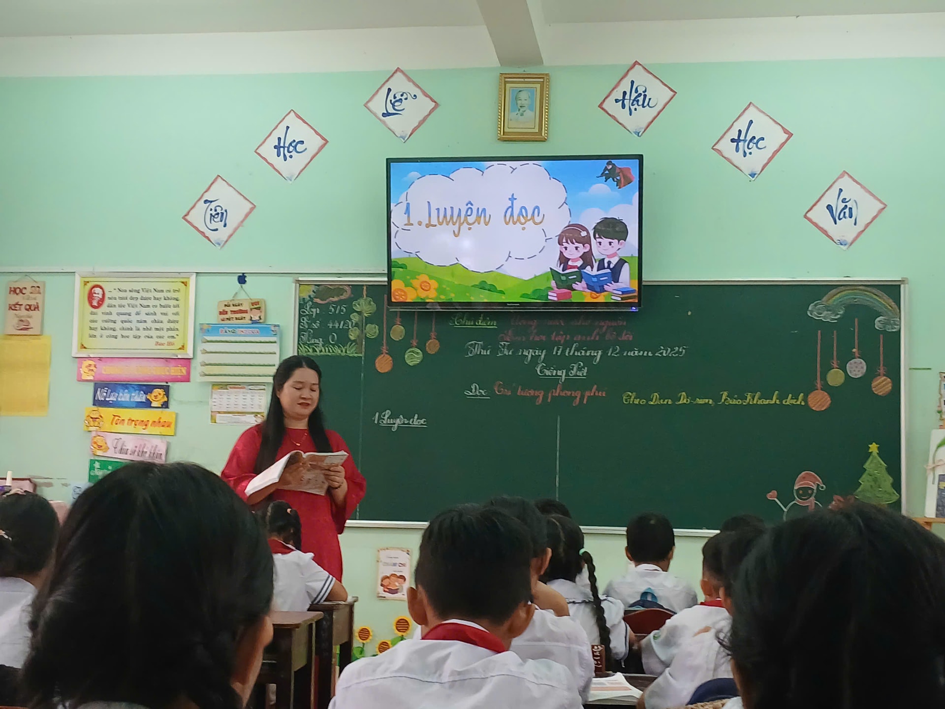 Cô Nguyễn Thi Hồng và học sinh trong giờ học. Ảnh: KHUÊ TRUNG