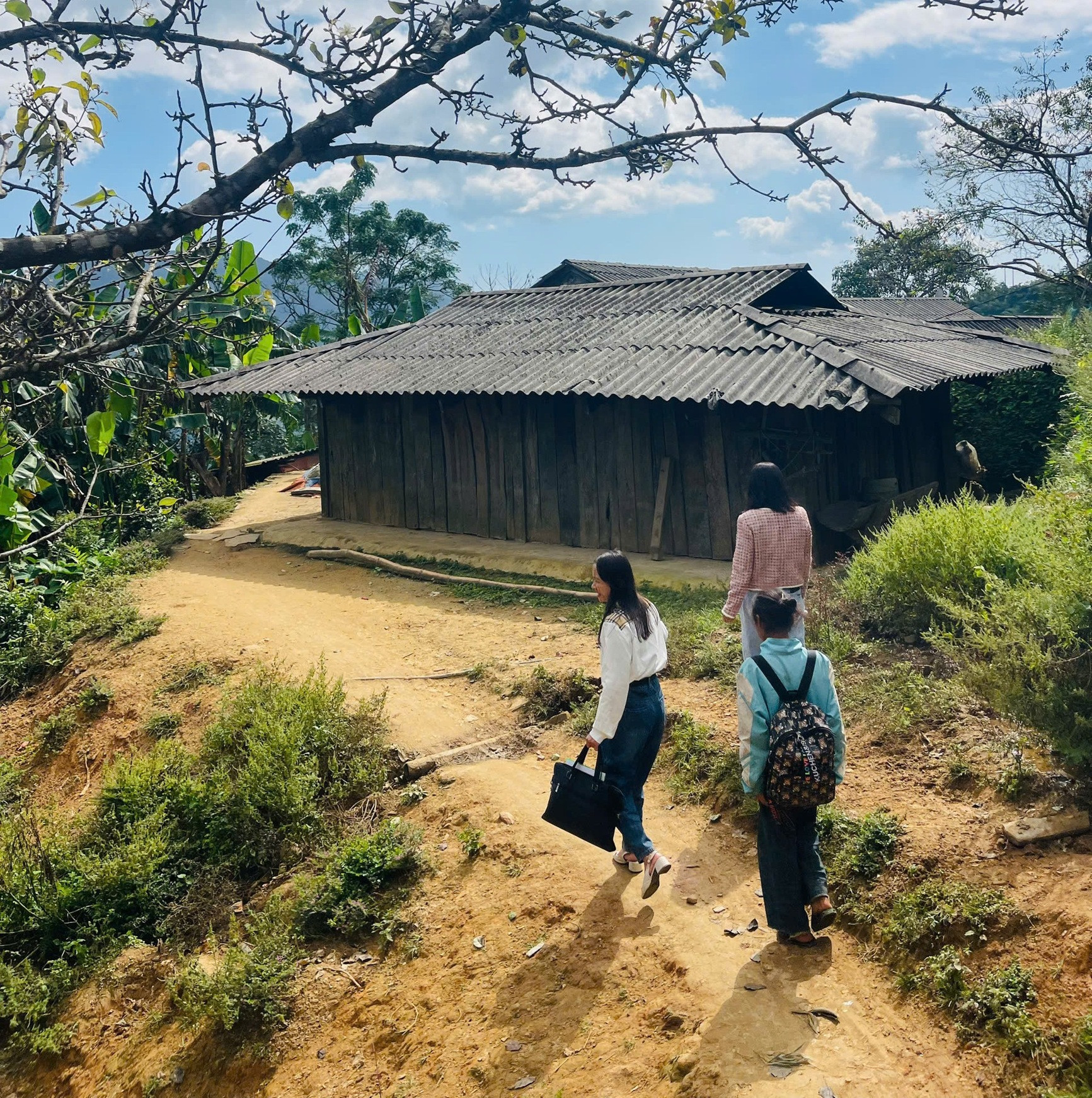 Cô giáo Kim Ngân trong một lần đến nhà học sinh để vận động không bỏ học, tảo hôn. Ảnh: NVCC