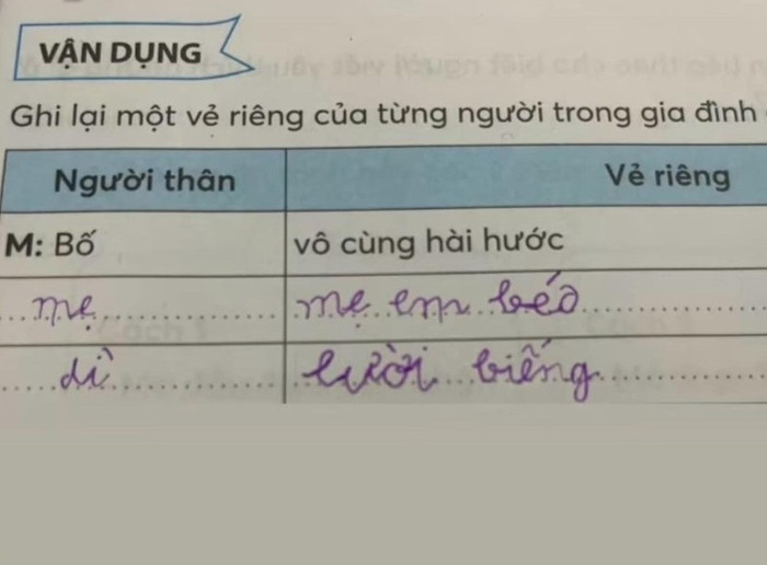 Theo đó, bài tập với đề bài như sau: "Ghi lại một vẻ riêng của từng người trong gia đình em". Ở phần người thân, bài tập đã có mẫu sẵn: "Bố - vô cùng hài hước". Ở 2 ô trống, em học sinh chọn tả về mẹ và dì như sau: "Mẹ - mẹ em béo" và "Dì - lười biếng".