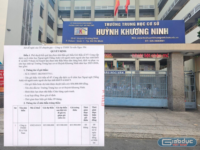 Tại Trường Trung học cơ sở Huỳnh Khương Ninh (phường Tân Định), trong năm học 2025-2026, Công ty Trách nhiệm hữu hạn ILA Việt Nam trúng thầu "Gói thầu số 7: Cung cấp dịch vụ tổ chức học ngoại ngữ (Tiếng Anh) với người nước ngoài cho học sinh khối 8 và 9" trị giá 856.000.000 đồng, ngày phê duyệt là 4/9/2025.