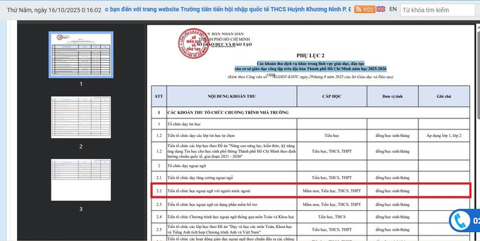 Ngày 16/10/2025, phóng viên truy cập vào website nhà trường, đơn vị có đăng tải một phụ lục về các khoản thu dịch vụ khác trong lĩnh vực giáo dục, đào tạo của cơ sở giáo dục công lập trên địa bàn Thành phố Hồ Chí Minh năm học 2025-2026. Tuy nhiên, file này không nêu cụ thể mức thu của nhà trường.