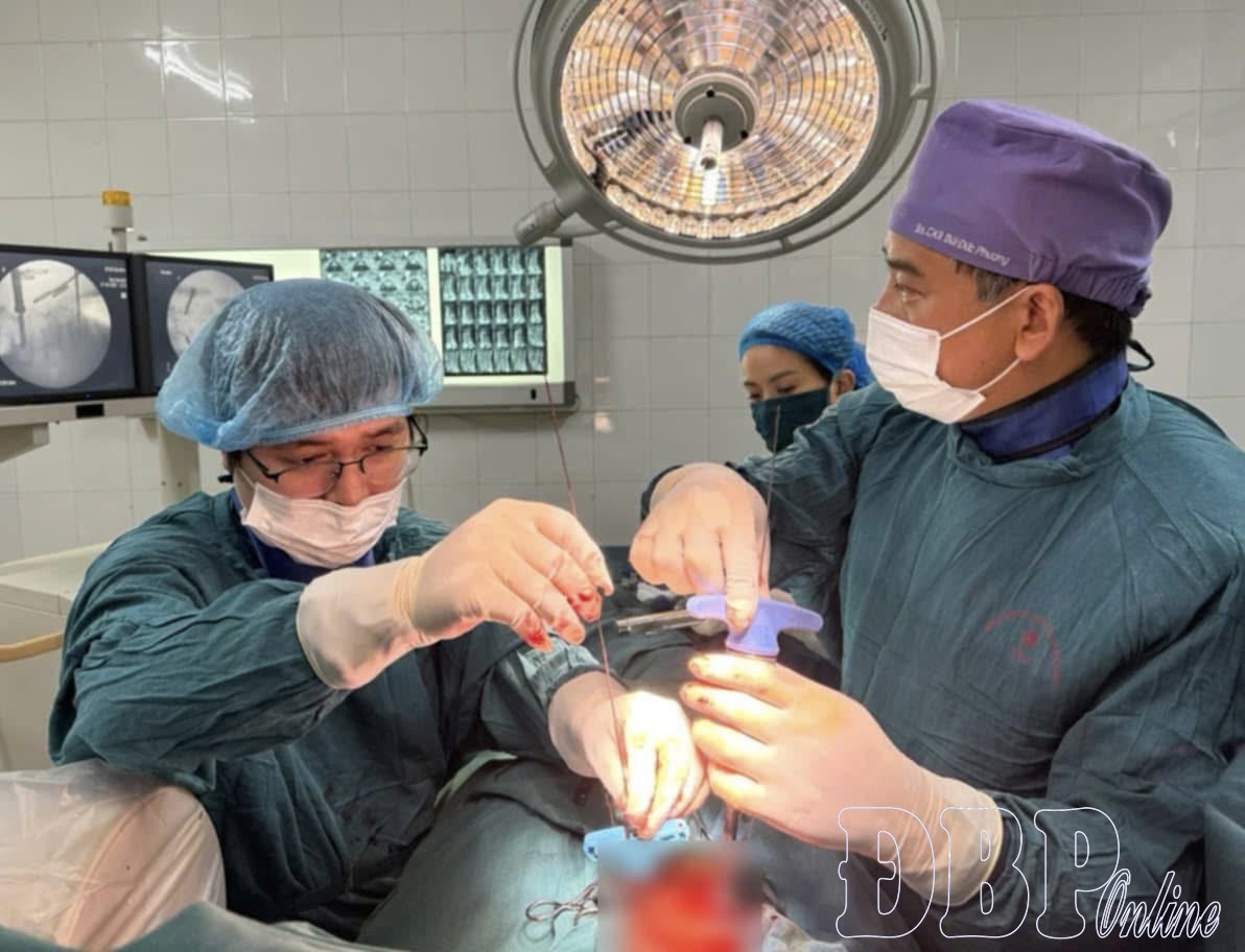 Bệnh nhân L.T.H. (49 tuổi, xã Na Sang) bị ngã thang đập vào vùng gáy hai tuần trước khi vào viện. Hình ảnh chụp cắt lớp vi tính cột sống cổ cho thấy vỡ lún thân đốt sống và gãy cung sau bên trái thân đốt sống C5 có chèn ép nhẹ vào ống sống ngang mức, là tổn thương nguy hiểm có thể gây liệt nếu chèn ép tủy nặng hơn. Người bệnh được phẫu thuật phục hồi đường cong sinh lý cột sống, thay thế đốt sống cổ vỡ vụn bằng vật liệu nhân tạo (lồng titan) để cố định, tái tạo cấu trúc cột sống vững chắc, dưới sự hỗ trợ của hệ thống C-ARM và khoan mài xương. Sau mổ, bệnh nhân tỉnh táo, giảm đau rõ rệt, có thể ngồi dậy và vận động nhẹ nhàng, các chức năng sinh lý hoạt động bình thường.
