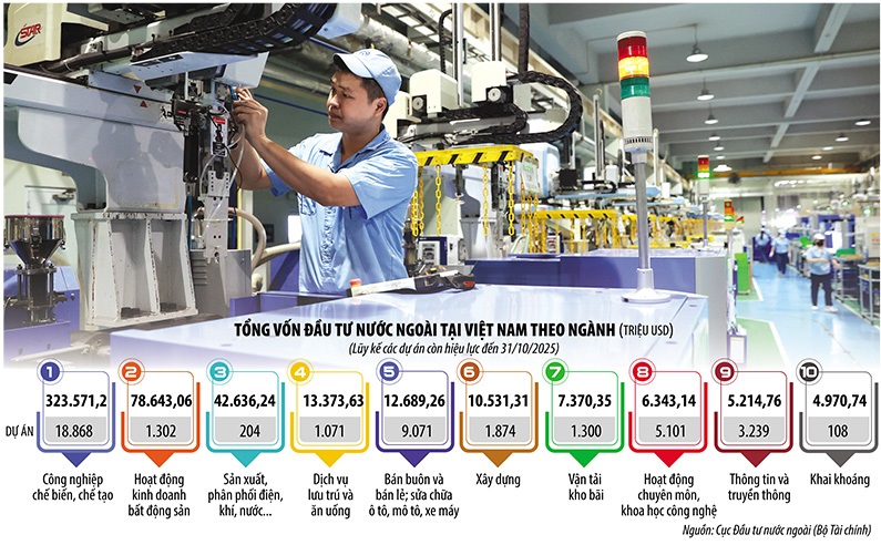 Dù không có các dự án tỷ USD, nhưng các Dự án quy mô lớn đã góp phần quan trọng đưa tổng vốn đầu tư nước ngoài đăng ký trong 10 tháng năm 2025 lên 31,5 tỷ USD, tăng 15,6% so với cùng kỳ năm ngoái.