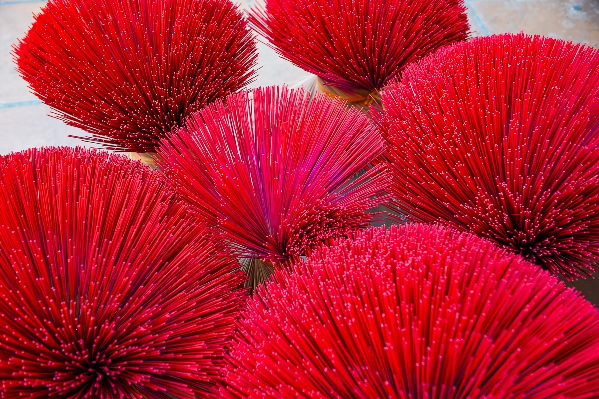 Tăm hương được làm từ tre, nứa hoặc vầu, chẻ mỏng, chuốt đều rồi phơi khô tự nhiên. Sau đó, phần chân tăm được nhuộm màu để tạo dấu hiệu nhận diện và thuận tiện khi sử dụng.