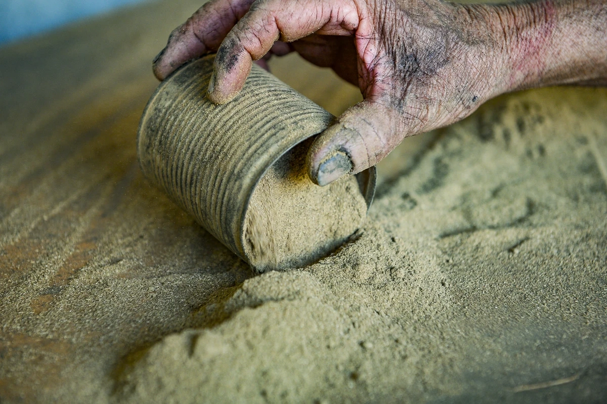 Công đoạn tiếp theo là làm nhựa khâu quan trọng nhất, quyết định độ cháy của hương. Nhựa cây trám được giã nhuyễn, trộn đều với than hoa xay mịn. Hỗn hợp này phải đạt độ dẻo vừa phải, không quá khô cũng không quá nhão. Những người làm vẫn phải căn chỉnh bằng kinh nghiệm, bởi chỉ cần sai tỷ lệ là hương sẽ không đạt yêu cầu.