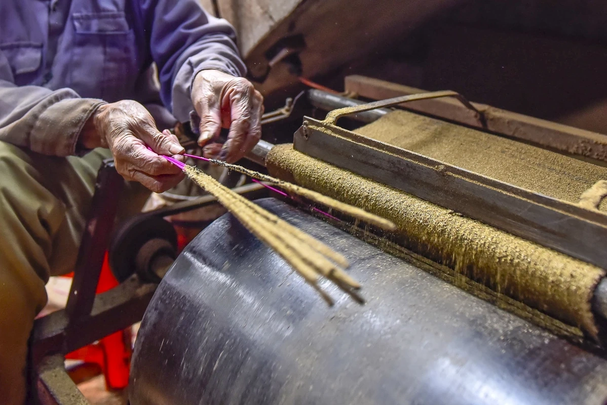 Sau đó người thợ lăn đều lớp nhựa trám lên thân tăm. Những đôi bàn tay đen sạm vì bột than, nhưng những que hương trong tay người thợ vẫn tròn đều, mịn màng, là kết quả của hàng chục năm gắn bó với nghề.