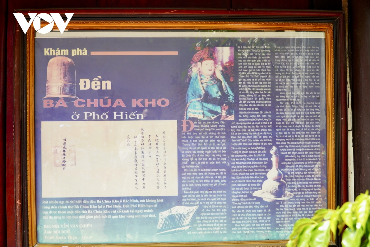 Ngôi đền là nơi thờ bà Lê Bạch Nương - người dân tôn kính gọi là Bà Chúa Kho. Theo truyền tích, bà xuất thân từ Hoàng tộc, là người phụ nữ tài sắc vẹn toàn, giỏi văn chương, tinh thông võ nghệ, một lòng trung quân ái quốc. Khi đất nước lâm nguy, bà được giao trọng trách trông coi kho ngân khố tại Vĩnh Ty Đồn (nay thuộc thành phố Hưng Yên).