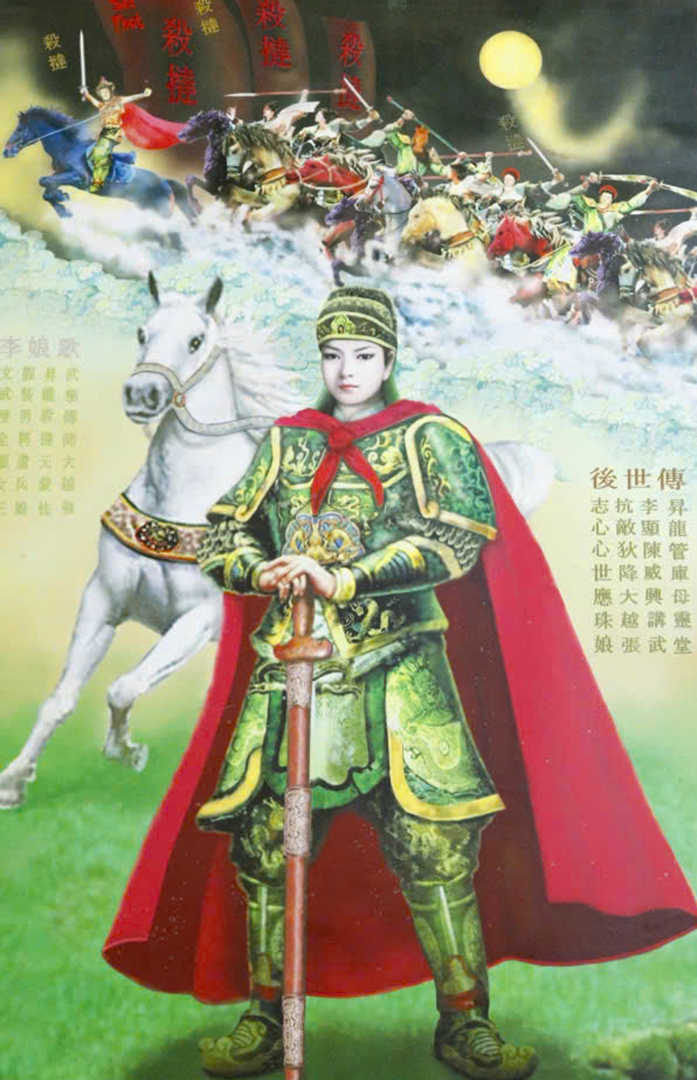 Bức thứ nhất đặc tả hình ảnh bà trong bộ võ tướng hùng dũng uy nghi bên con chiến mã bạch tuyền, xa xa có đội quân nữ đang xung trận. Bên dưới có hai bài thơ chữ Hán ca ngợi việc bà giả trai ra trận cũng như công lao to lớn của bà. Bức thứ hai là hình ảnh thánh mẫu Châu Nương đã hóa, quảng đại thần thông, đã có phép phù linh cho hậu thế.