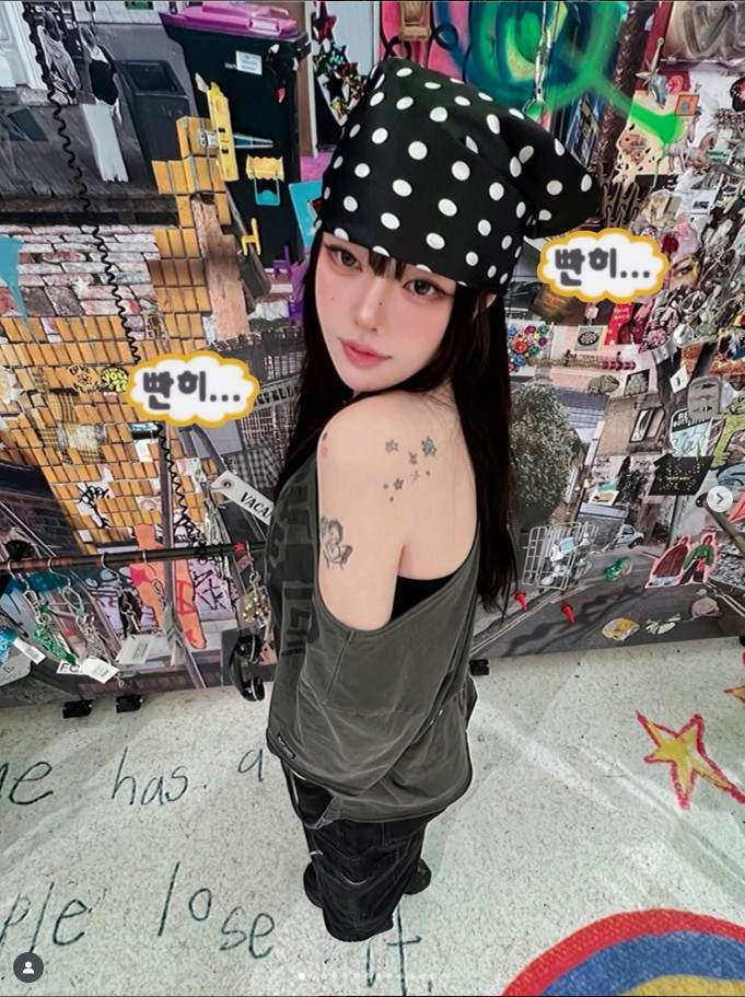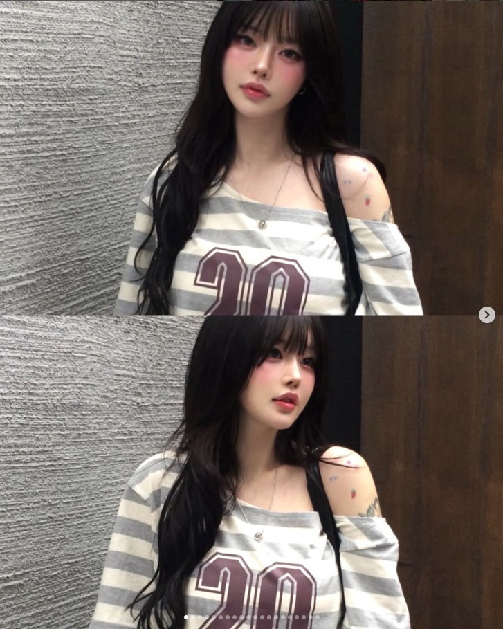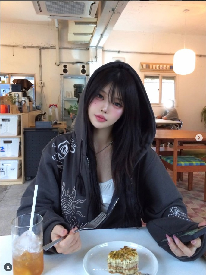 Nhan sắc của Hyeji là sự kết hợp hoàn hảo giữa nét thơ ngây và vẻ trưởng thành, sắc sảo. Gương mặt cô nhỏ nhắn, thanh tú, được tô điểm bằng lớp trang điểm đậm chất Hàn Quốc nhưng lại mang hơi thở nổi loạn của phong cách Y2K/E-girl. Đôi mắt to tròn và có phần trẻ con, thế nhưng điều thực sự mê hoặc lại là ánh nhìn.