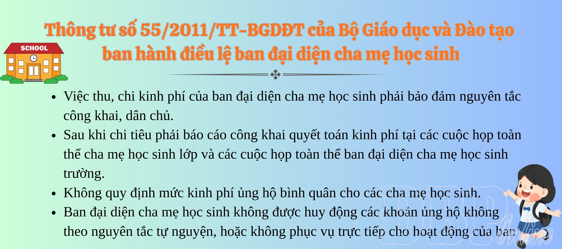 Đáng chú ý, không quy định mức kinh phí ủng hộ bình quân cho cha mẹ học sinh. Và ban đại diện cha mẹ học sinh không được huy động các khoản ủng hộ không theo nguyên tắc tự nguyện, hoặc không phục vụ trực tiếp cho hoạt động của ban, như: Bảo vệ cơ sở vật chất của nhà trường, bảo đảm an ninh nhà trường; trông coi phương tiện tham gia giao thông của học sinh; vệ sinh lớp học, vệ sinh trường; khen thưởng cán bộ quản lý, giáo viên, nhân viên nhà trường; mua sắm máy móc, trang thiết bị, đồ dùng dạy học cho trường, lớp học hoặc cho cán bộ quản lý, giáo viên và nhân viên nhà trường; hỗ trợ công tác quản lý, tổ chức dạy học và các hoạt động giáo dục; sửa chữa, nâng cấp, xây dựng mới các công trình của nhà trường.