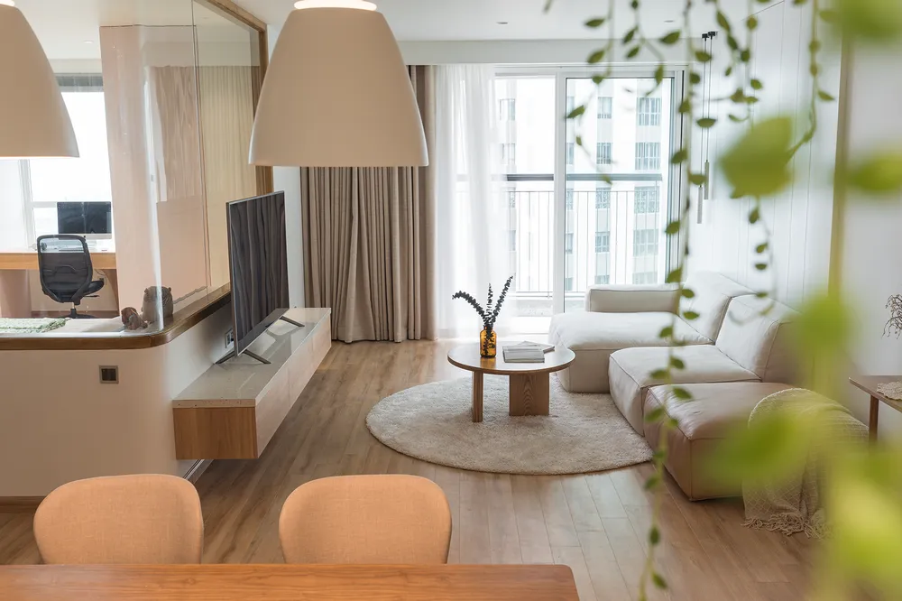 Việc lát sàn gỗ giúp không gian phòng khách trở nên sang trọng, ấm áp hơn.