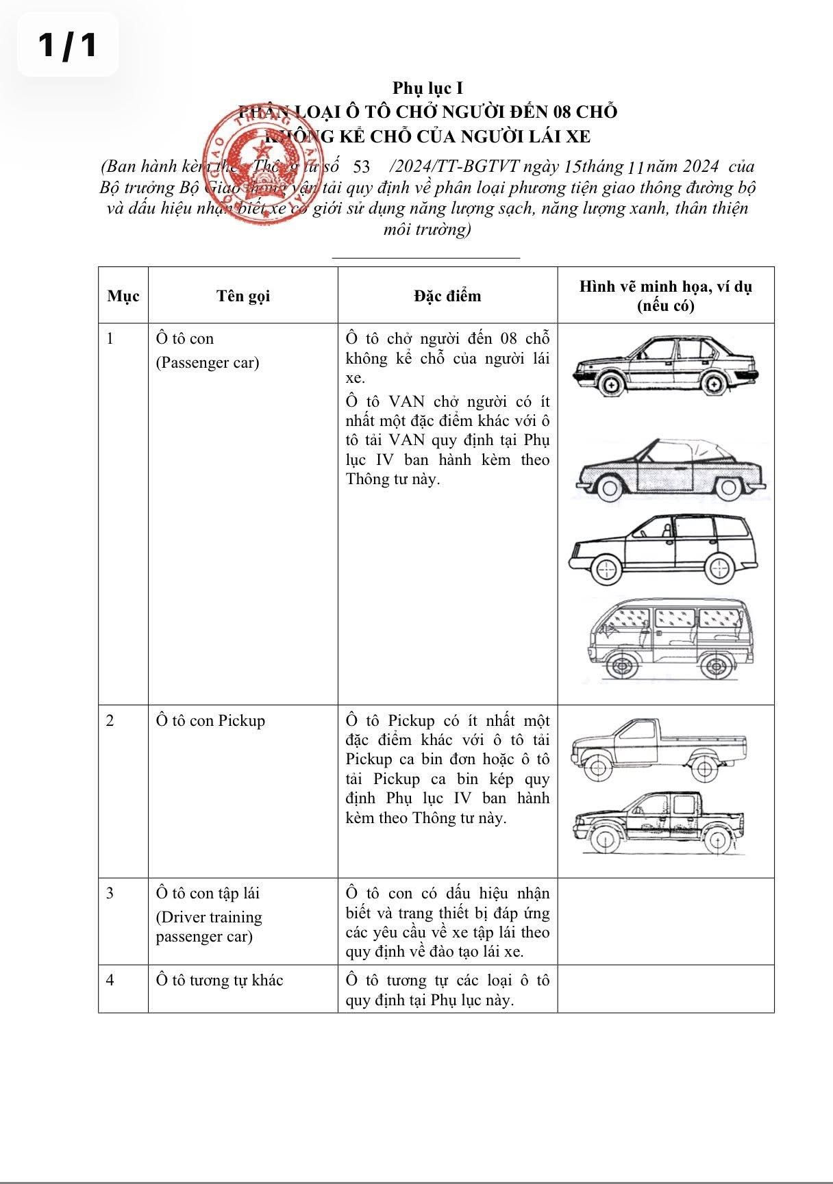 Ô tô con Pickup (thuộc loại ô tô chở người đến 08 chỗ ngồi không kể chỗ của người lái xe, mục 2 phụ lục I Thông tư 53);