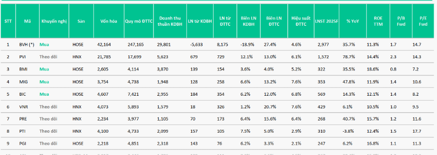 Trong nhóm doanh nghiệp đầu ngành, Tập đoàn Bảo Việt (BVH) tiếp tục được đánh giá cao nhờ vị thế dẫn đầu ở mảng bảo hiểm nhân thọ và nằm trong nhóm đầu ở mảng phi nhân thọ. BVH sở hữu lợi thế thương hiệu lâu năm, mạng lưới phân phối rộng khắp và danh mục đầu tư quy mô lớn. Khi doanh thu bảo hiểm nhân thọ dần ổn định trở lại và thu nhập từ hoạt động đầu tư được cải thiện nhờ mặt bằng lãi suất cao hơn, BVH được kỳ vọng hưởng lợi rõ nét trong chu kỳ phục hồi của ngành.