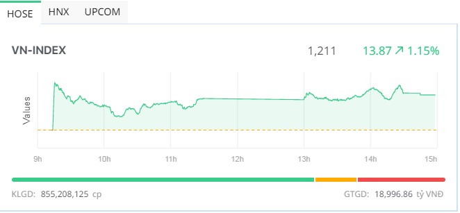 Chốt phiên, VN-Index tăng 13,87 điểm (+1,16%), lên 1.211 điểm với 416 mã tăng, trong khi chỉ có 120 mã giảm. Tổng khối lượng giao dịch đạt 855,2 triệu đơn vị, giá trị 18.996,9 tỷ đồng, giảm 50% về khối lượng và hơn 44% về giá trị so với phiên hôm qua. Trong đó, giao dịch thỏa thuận đóng góp 68,7 triệu đơn vị, giá trị 1.846 tỷ đồng.