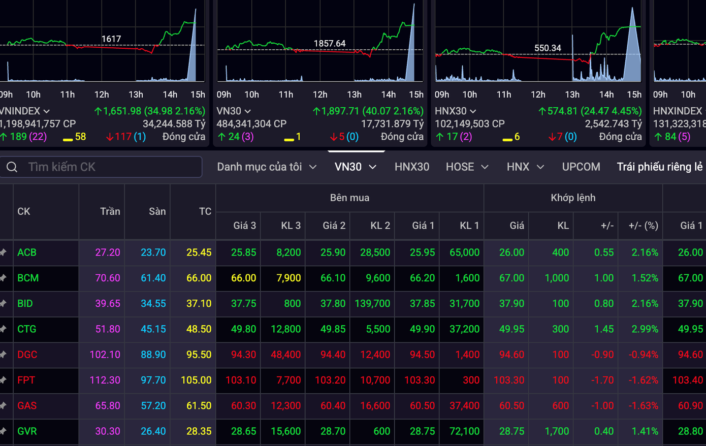 Ngoài bất động sản, nhóm chứng khoán và thép cũng đồng loạt phục hồi mạnh sau giai đoạn bị bán tháo. Nhiều cổ phiếu chứng khoán như SSI, VND, HCM, MBS tăng từ 3-6%, trong khi nhóm thép như HPG, HSG, NKG cũng đồng loạt bật xanh.