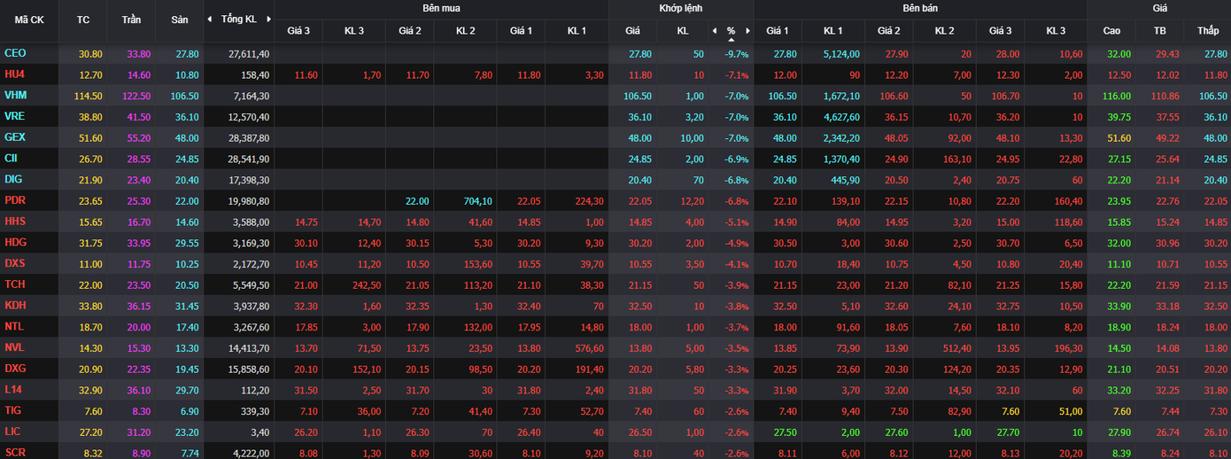 Nhóm bất động sản chịu ảnh hưởng nặng nề, nhiều mã như CII, GEX, CEO, DIG… đồng loạt giảm sàn.
