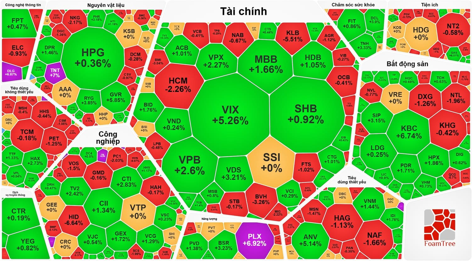 Nhóm cổ phiếu ngân hàng cũng nghiêng về sắc xanh: VPB tăng 2,6%, HDB tăng 1,05%, MBB tăng 1,66%, BID tăng 1,76%, CTG tăng 2,01%, TCB tăng 1,4%, ACB tăng 1,01%...