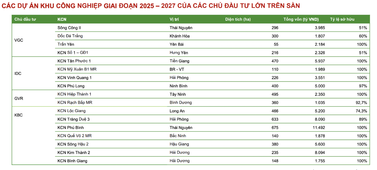 Nguồn cung Khu công nghiệp mới giai đoạn 2025 – 2027 dự báo tăng. Trong đó, khu vực miền Bắc bổ sung 6.500ha đất Khu công nghiệp tập trung ở Bắc Ninh, Hải Phòng, Ninh Bình mới với các Khu công nghiệp như Tràng Duệ 3, Vinh Quang, Kim Thành 2, Đồng Văn V, VI. Khu vực phía Nam dự báo nguồn cung tăng thêm 7.300ha, tập trung tại Bình Dương, Đồng Nai, và các tỉnh vùng ven Tây Ninh, Long An, Vũng Tàu sẽ trở thành điểm sáng mới với các KCN mới như Nam Tân Uyên 3, VSIP 3, Cây Trường, Mỹ Xuân, Nam Thuận.